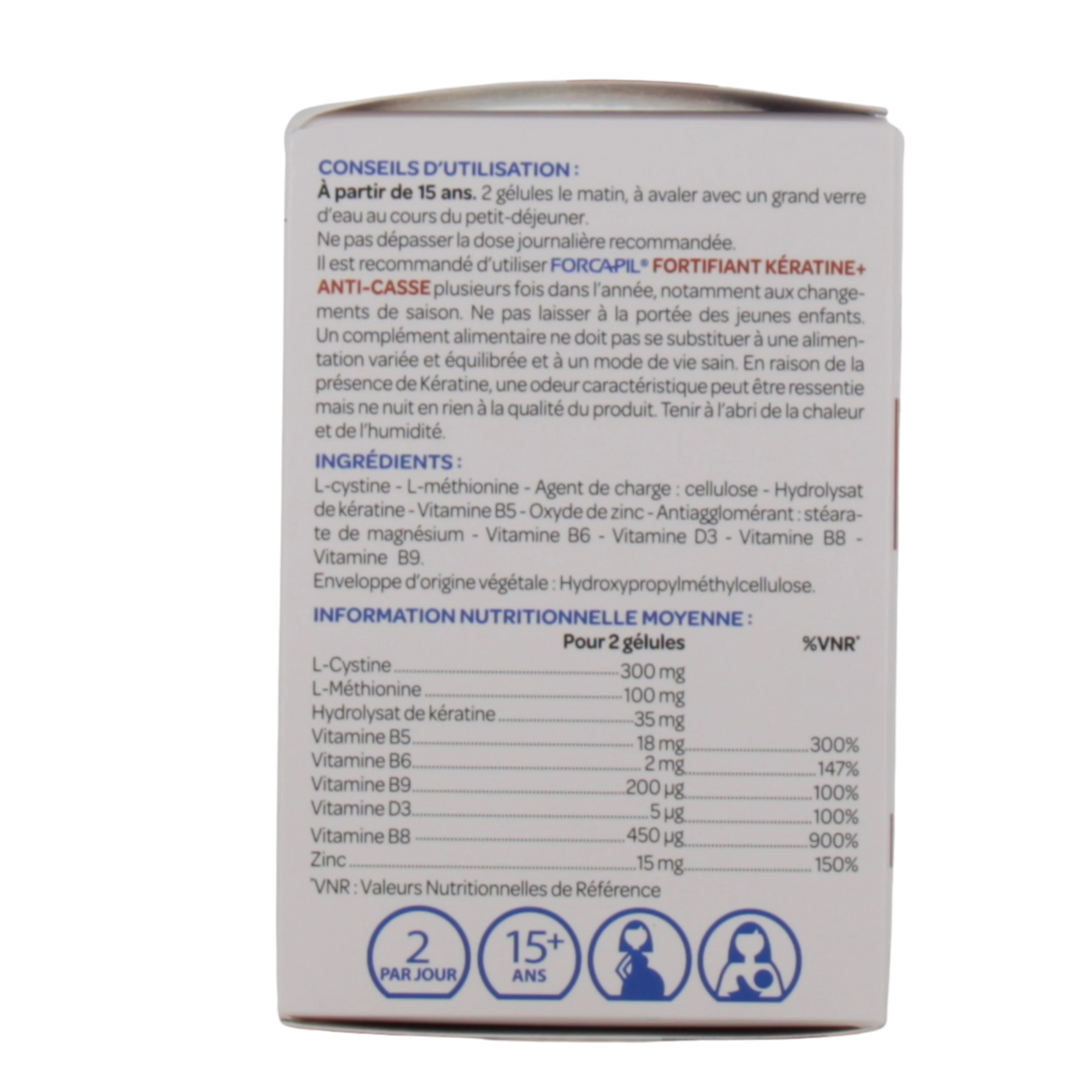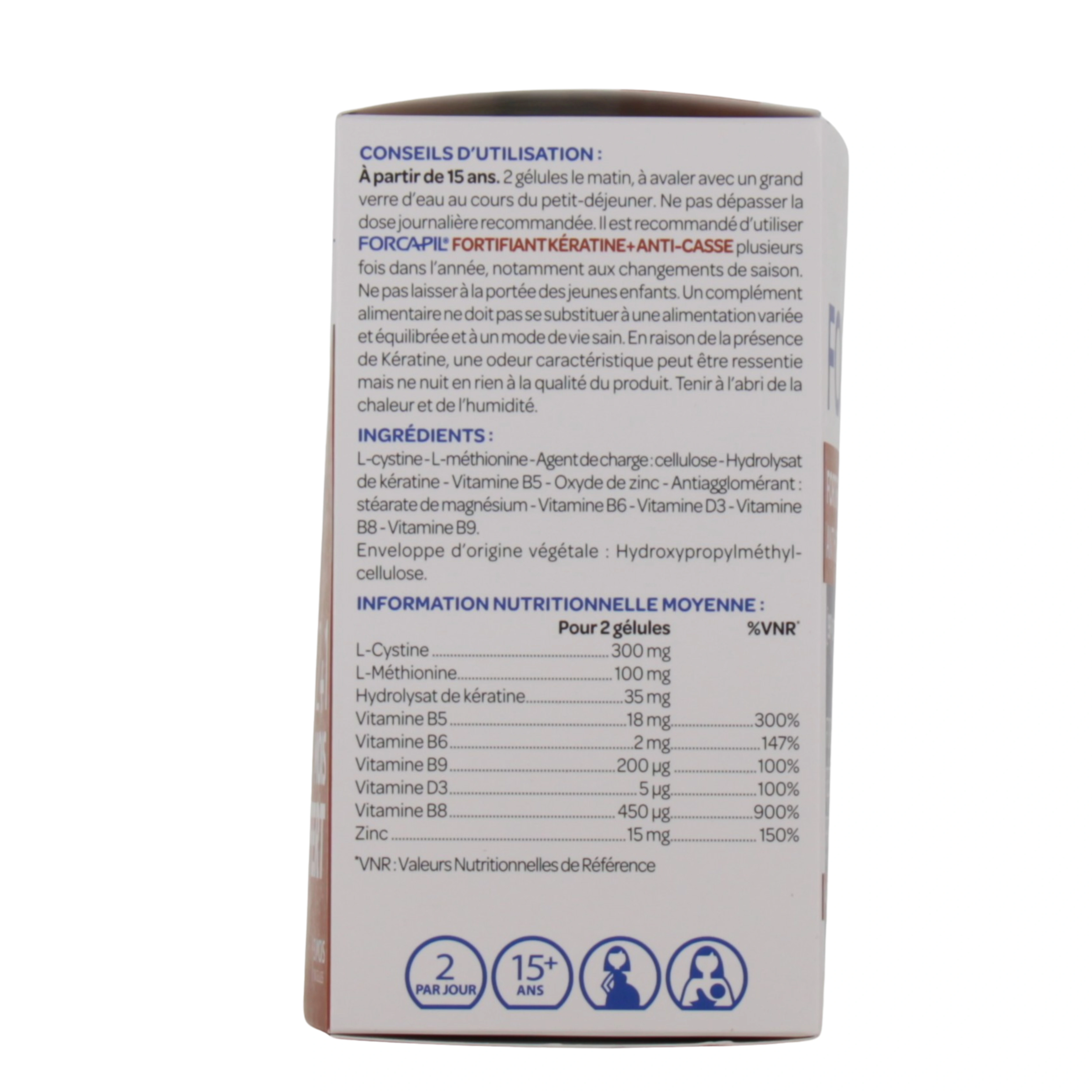 Enfin, Forcapil Fortifiant Kératine + aide à maintenir la bonne santé des cheveux, grâce à la vitamine B8 (biotine) et à favoriser la synthèse des acides aminés grâce à la vitamine B9.