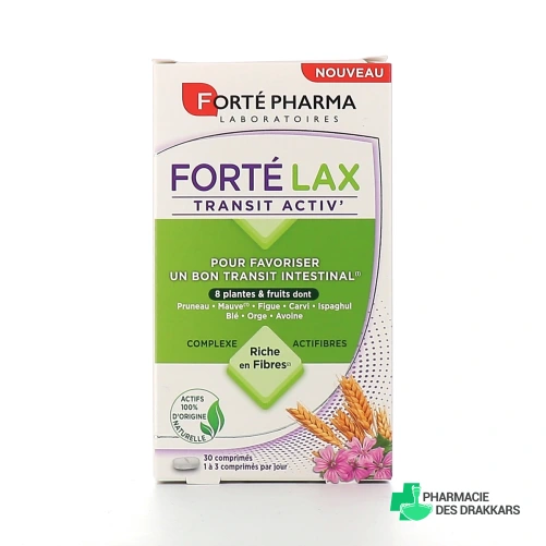 Conditionnement de Forté Lax Transit Activ sur Pharmacie des Drakkars : boîte de 30 comprimés, cure de 10 à 30 jours.