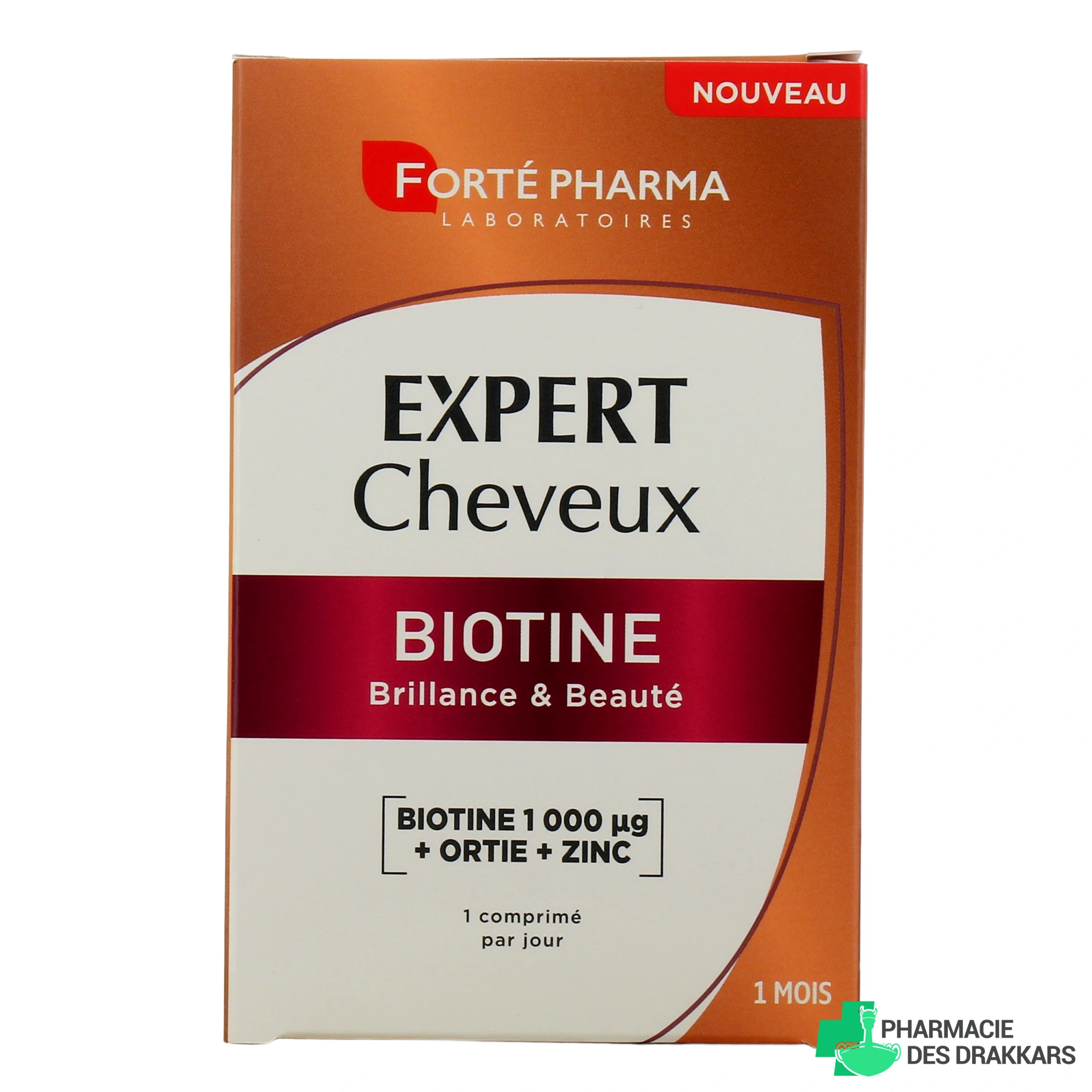 Présentation proposée par notre pharmacie en ligne pour Forté Pharma Expert Cheveux Biotine : boîte de 30 comprimés pour 1 mois de prise.