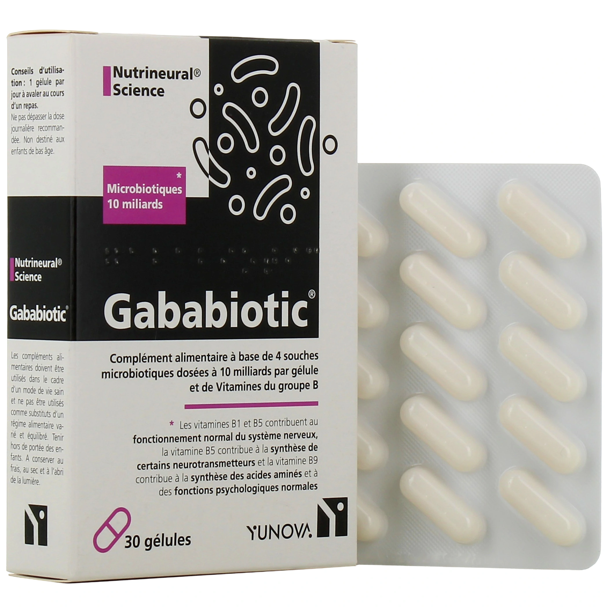 Mis au point par le laboratoire Yunova, Gababiotic est un complément alimentaire à base de souches microbiotiques et de vitamines du groupe B. Il cible à la fois la flore intestinale et le système nerveux.