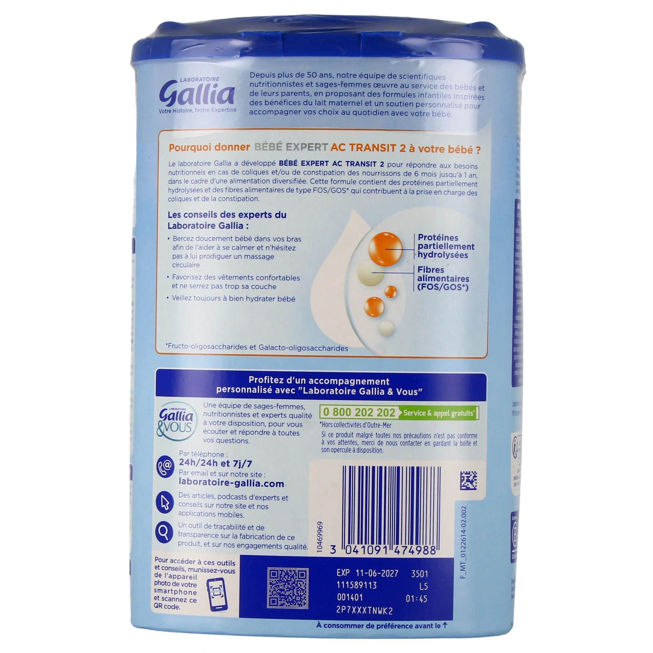 Le lait Bébé Expert AC Transit 2ème âge de Gallia est un lait infantile en poudre doté d'une nouvelle formule contenant des protéines partiellement hydrolysées et des fibres alimentaires de type FOS/GOS qui contribuent à la prise en charge des coliques et de la constipation.