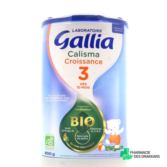 Calisma Croissance Bio allie l'expertise du Laboratoire Gallia aux exigences de l'agriculture biologique. Cette formule contribue à couvrir les besoins nutritionnels spécifiques de votre bébé dès 10 mois. Elle contient notamment de la vitamine D nécessaire à la croissance et au développement osseux normaux des jeunes enfants. Gallia Calisma Bio 3 renferme également du DHA (omega 3) qui contribue aux développements visuel et cérébral normaux. Les fibres FOS/GOS (fructo-oligosaccharides et galacto-oligosaccharides) disposent d'une structure inspirée des oligosaccharides présents dans le lait maternel. Finalement, les vitamines A, C et D contribuent au fonctionnement normal du système immunitaire.