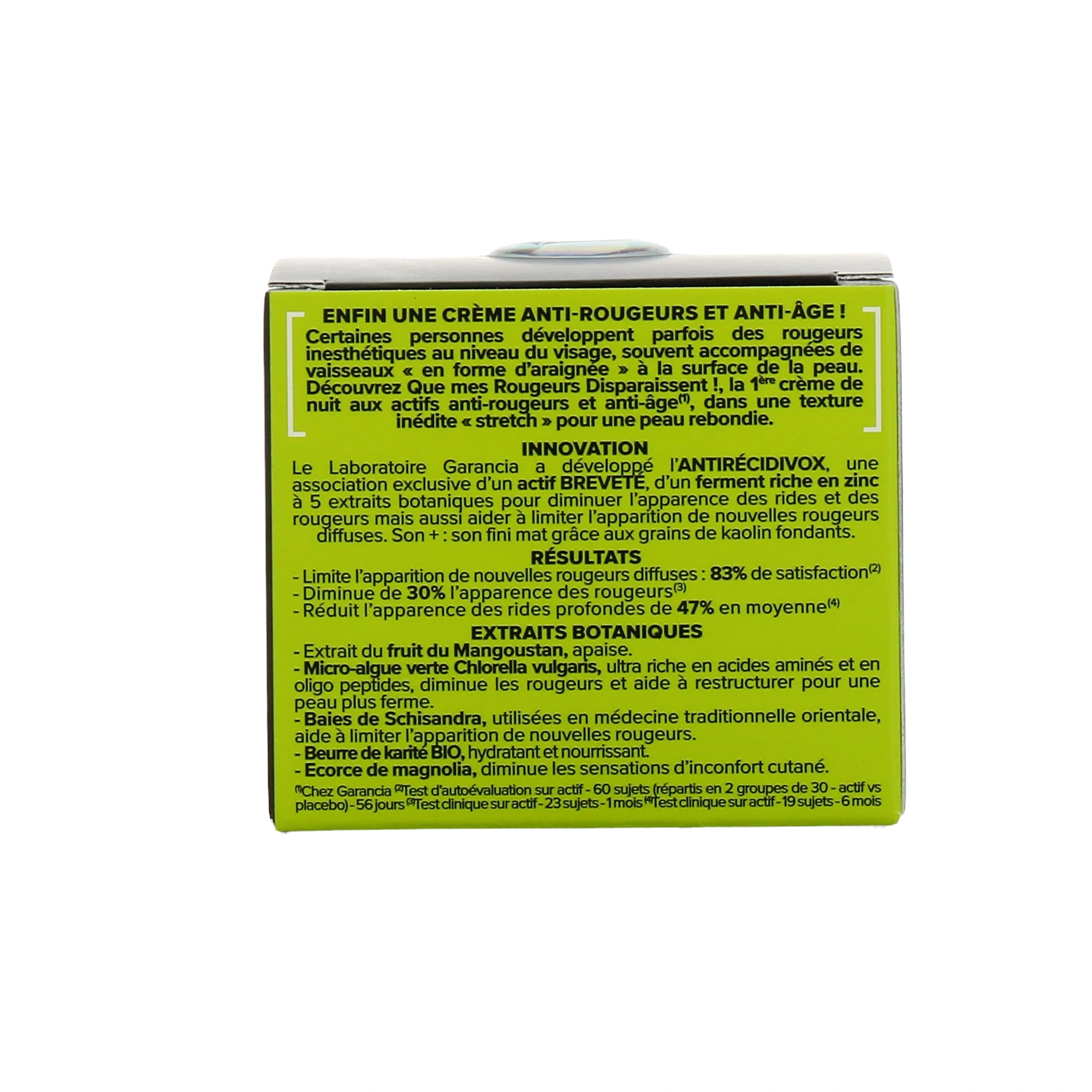 "Que Mes Rougeurs disparaissent" de Garancia est un traitement de fond contre les rougeurs proposé en soin de nuit. La nuit est le moment le plus efficace pour traiter les problèmes de peau car c’est lors du sommeil que la peau se régénère au maximum. La crème de nuit Garancia "Que mes rougeurs disparaissent" est formulée à base d'extraits botaniques, de zinc fermenté et d'un actif breveté. Véritable soin 2 en 1, cette crème sauve la peau de ses rougeurs et atténue visiblement les rides.