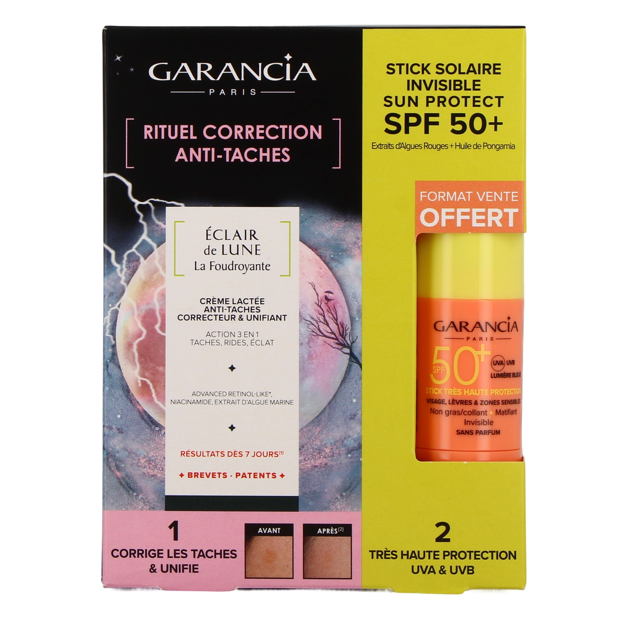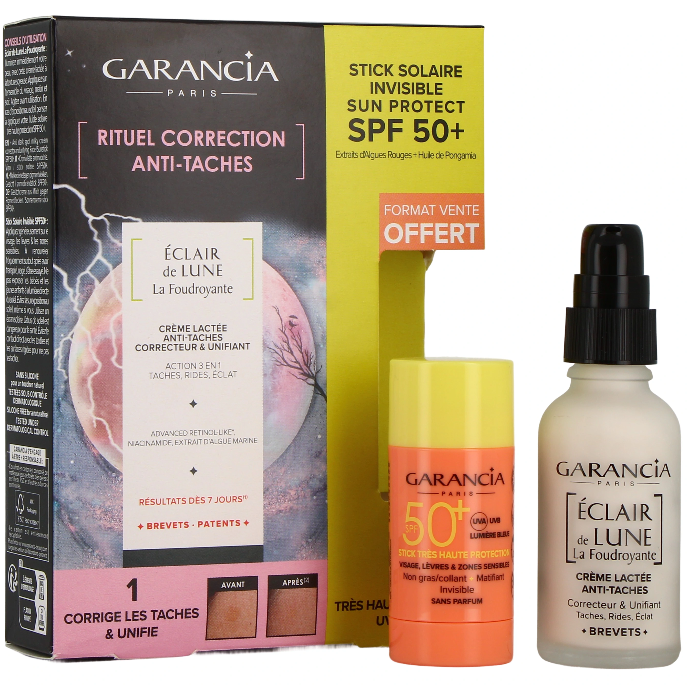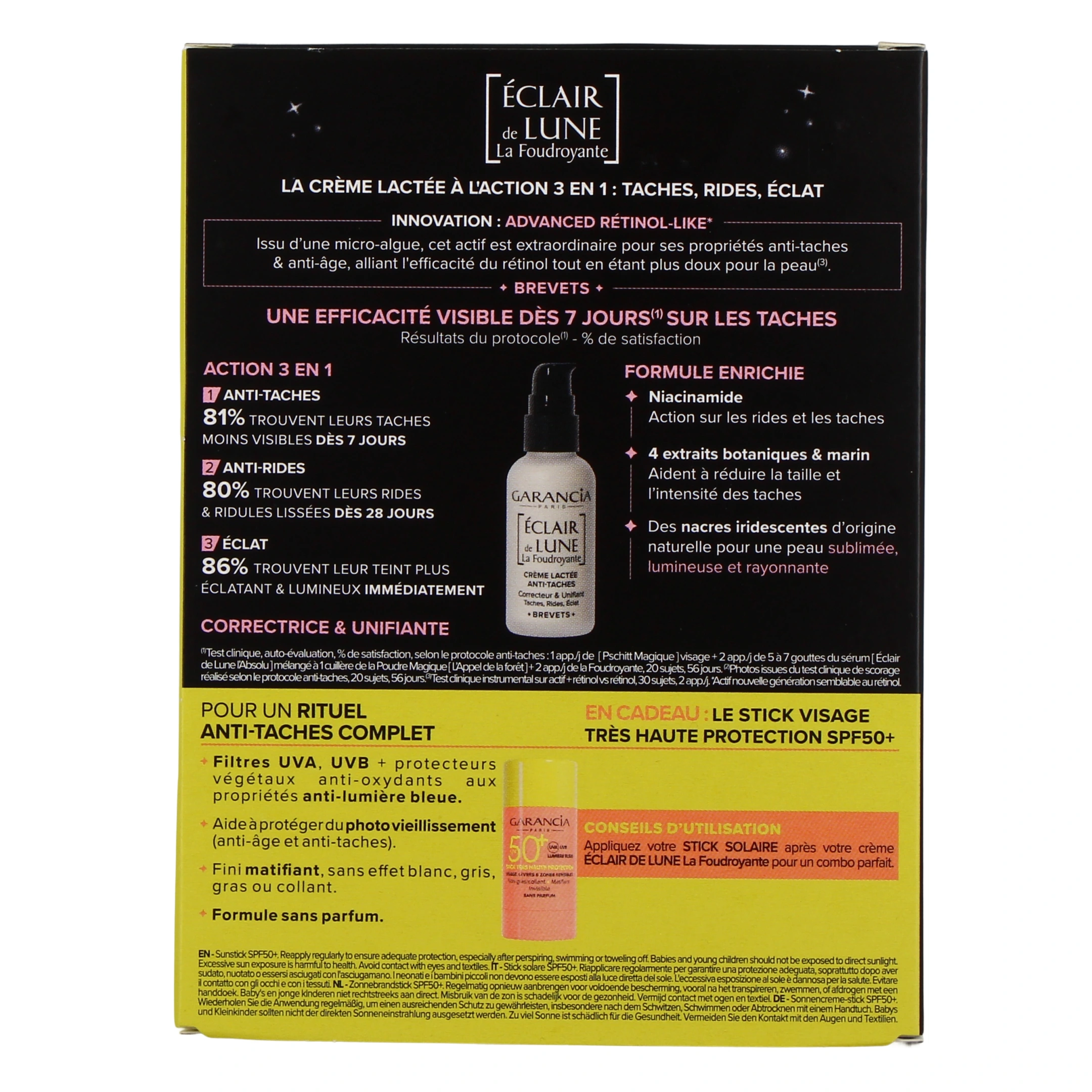 Dotée d'une formule enrichie en Advanced Rétinol-Like, un rétinol de nouvelle génération, la crème lactée anti-taches Eclair de Lune La Foudroyante Garancia est un soin à l'action 3 en 1 qui agit à la fois sur les taches, l'éclat du teint et les rides. Elle vous permettra d'obtenir des résultats visibles dès 7 jours d'utilisation grâce à son complexe Skin Bright Corrector Technology, qui associe :