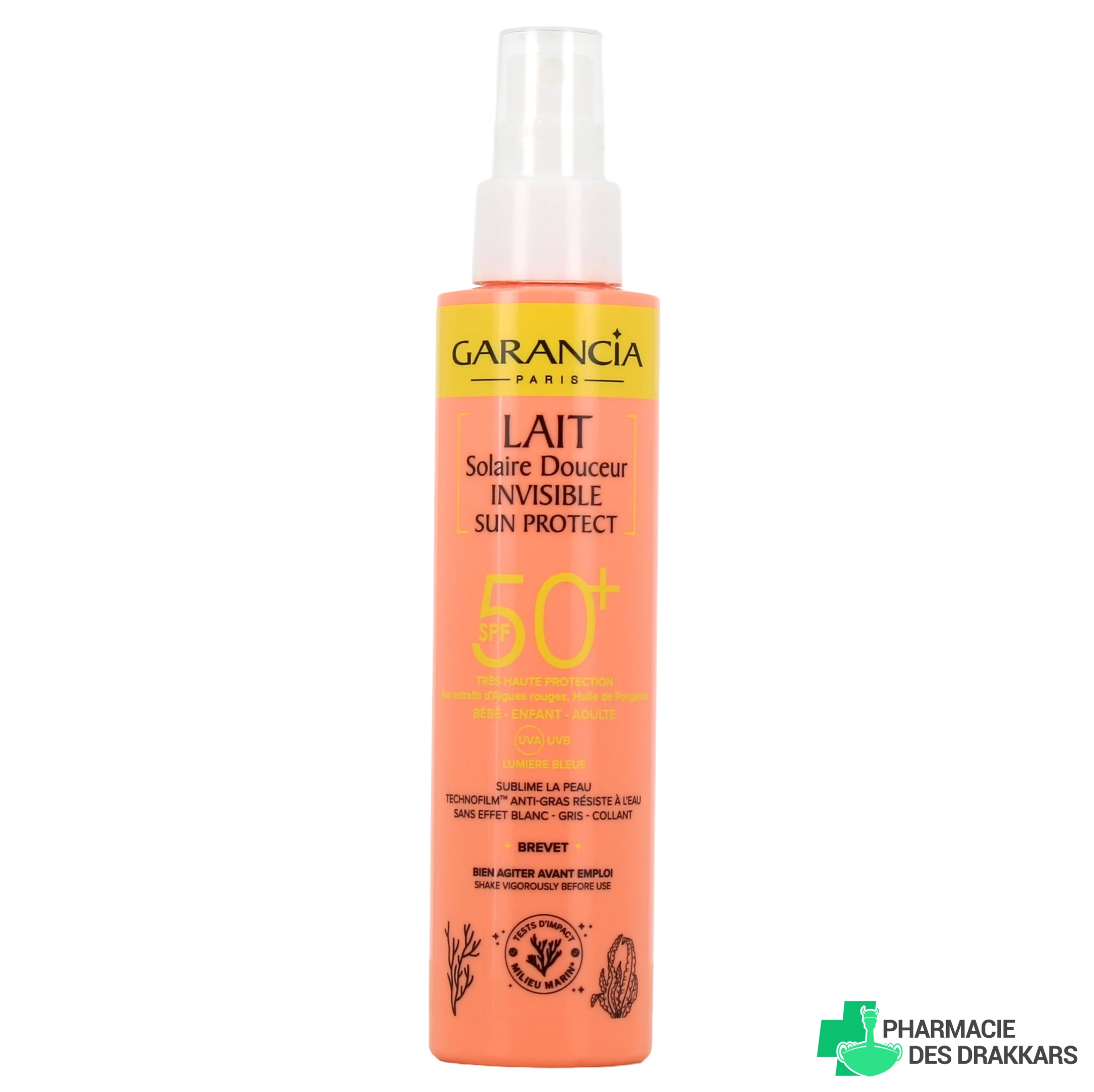 Le lait solaire Douceur Invisible Sun Protect SPF 50+ de Garancia est proposé dans les conditionnements suivants chez Pharmacie des Drakkars : flacon spray de 150 ml.