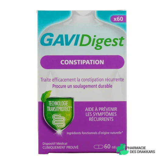 GAVIDigest Constipation est un dispositif médical sous forme de gélules, et destiné à traiter efficacement la constipation récurrente. Il s'adresse à toutes les personnes qui souffrent de manière fréquente de symptômes du SII (avec ou sans diagnostic de syndrome, et en l'absence de signaux d'alerte ou de maladie organique), et est destiné à prévenir et à soulager les symptômes récurrents de constipation.