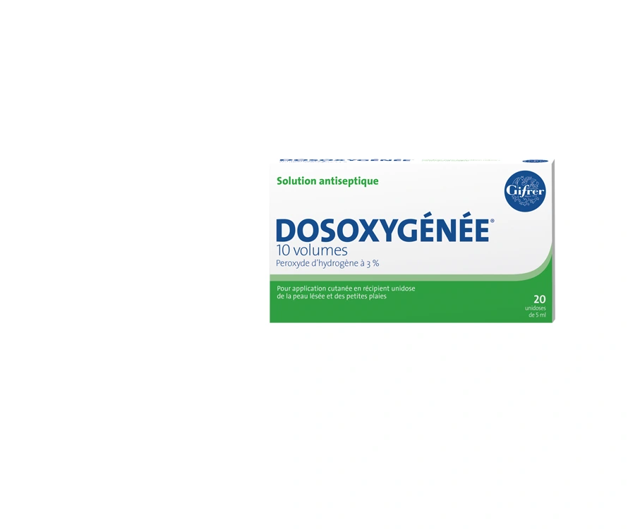 Gifrer Dosoxygénée 10 volumes est un antiseptique local pour la peau proposé sous la forme d'une solution pour application cutanée en récipient unidose.