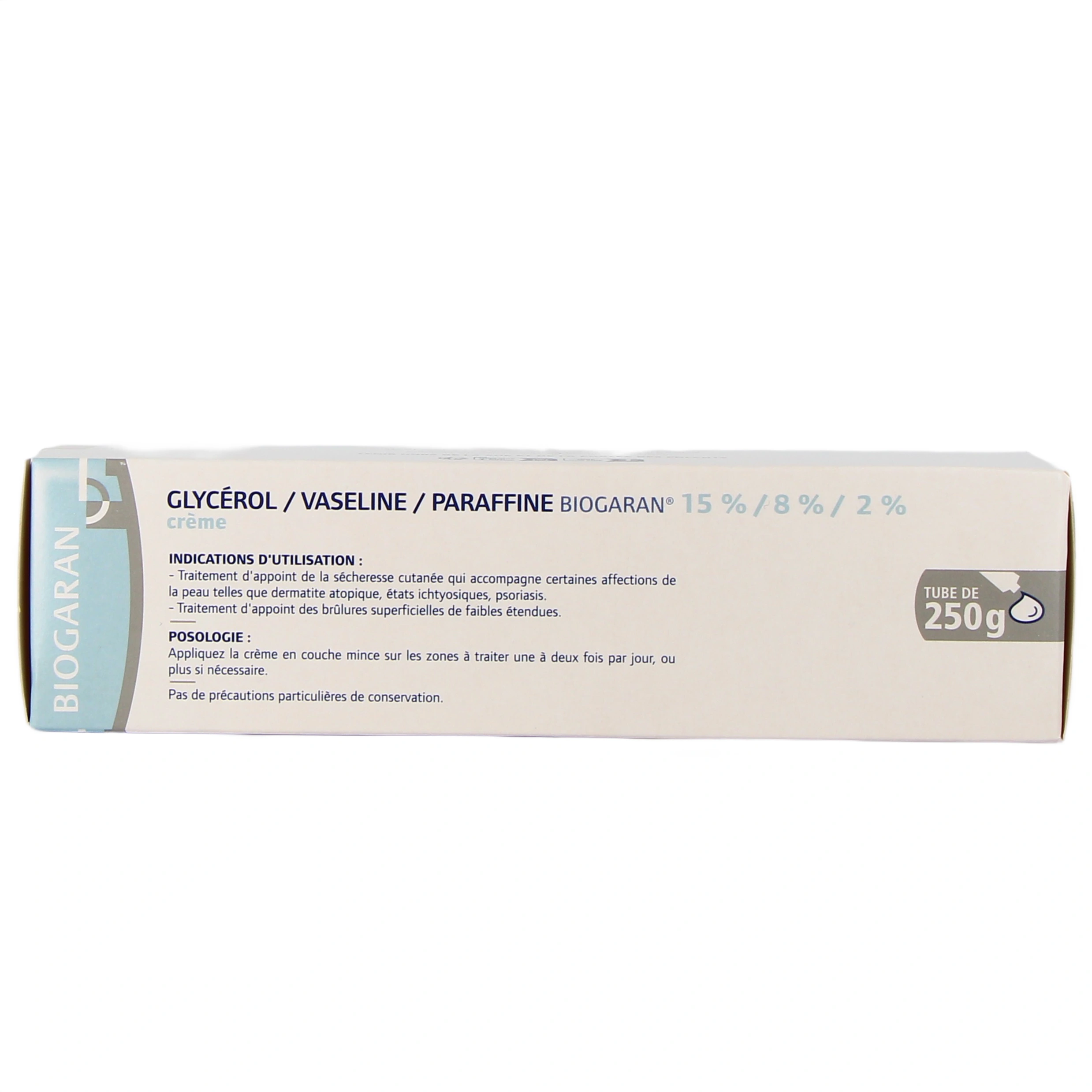 - Glycérol (15%) Vaseline (8%) Paraffine (2%) crème en tube de 250 g.