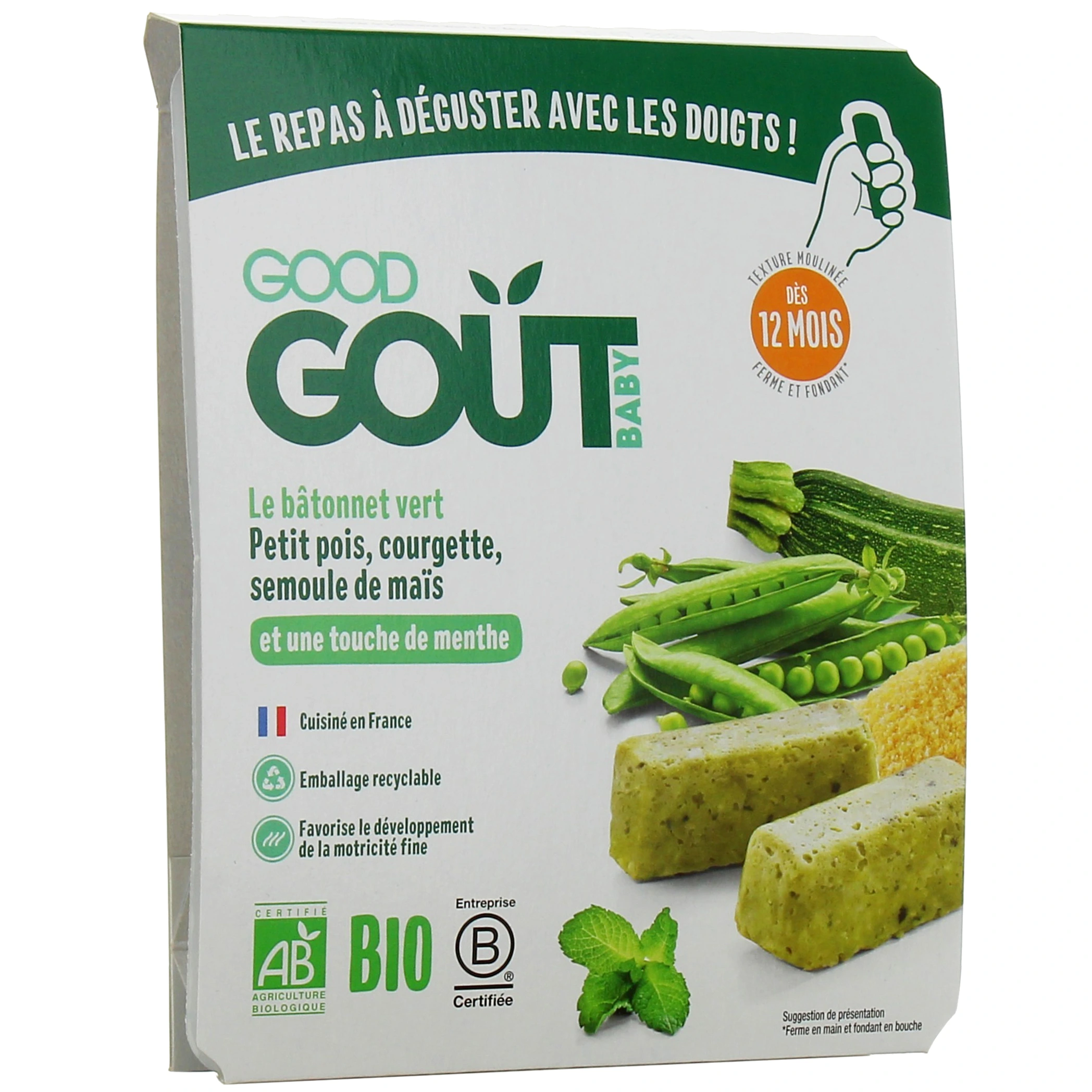 Consommés seuls ou intégrés à un repas complet avec de la viande ou du poisson, les bâtonnets verts Good Goût reposent sur une recette à base de petit pois, courgette et semoule de maïs, auxquels s'ajoutent une goutte de jus de citron et une légère touche de menthe, le tout issu de l'agriculture biologique. Ainsi, ils constituent un produit sain pour les enfants et bons pour la planète !