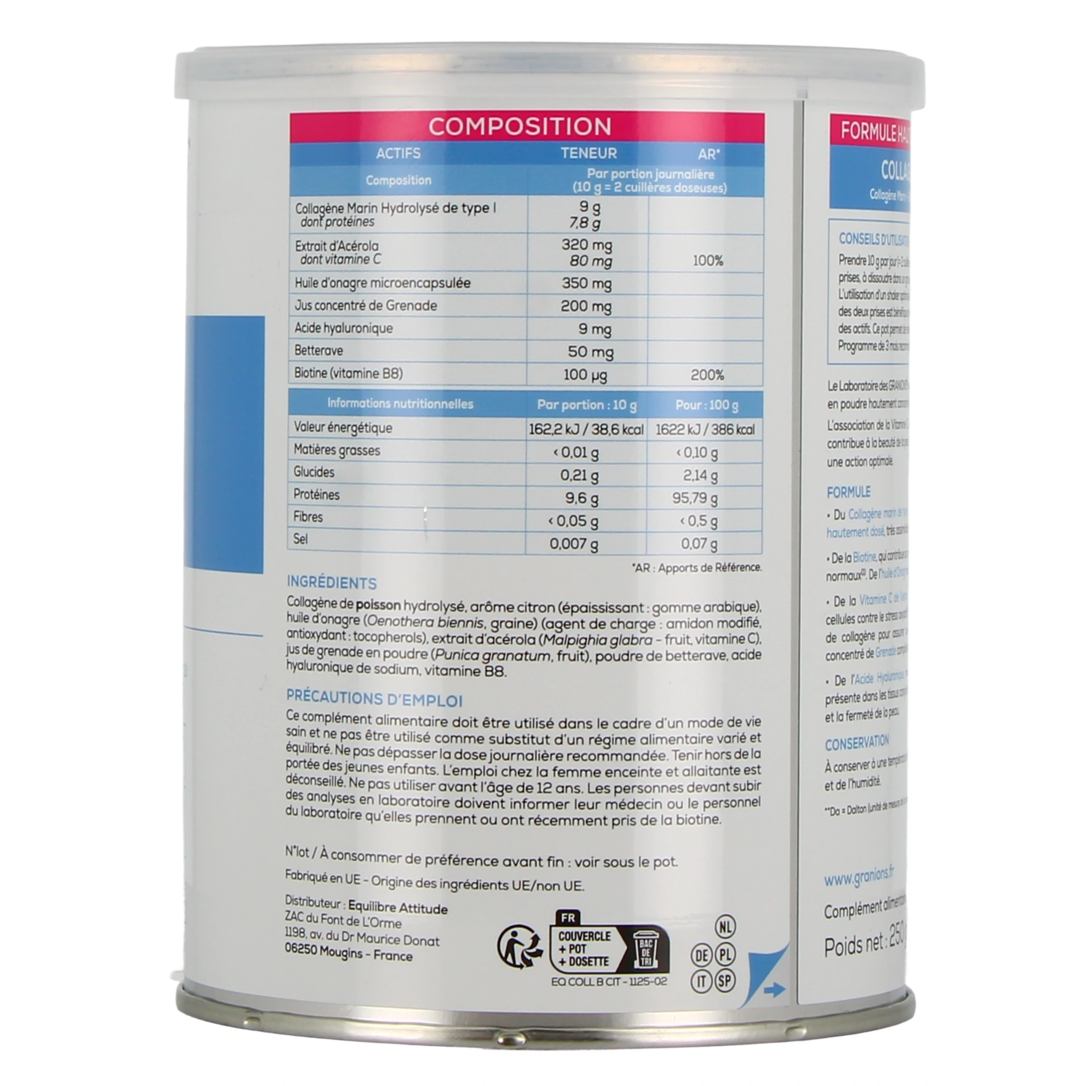 Le complément alimentaire Granions Collagène+ Beauté est formulé à base de collagène marin (collagène marin hydrolisé de type I de bas poids moléculaire hautement assimilable par l'organisme), de biotine (ou vitamine B8), de vitamine C naturelle et de bourrache. Le Laboratoire des Granions a développé un complexe à base de collagène en poudre hautement concentré et d’acide hyaluronique. L’association de la vitamine C, puissant antioxydant et de la biotine, qui contribue à la beauté de la peau et des cheveux, complètent la formule pour une action optimale.