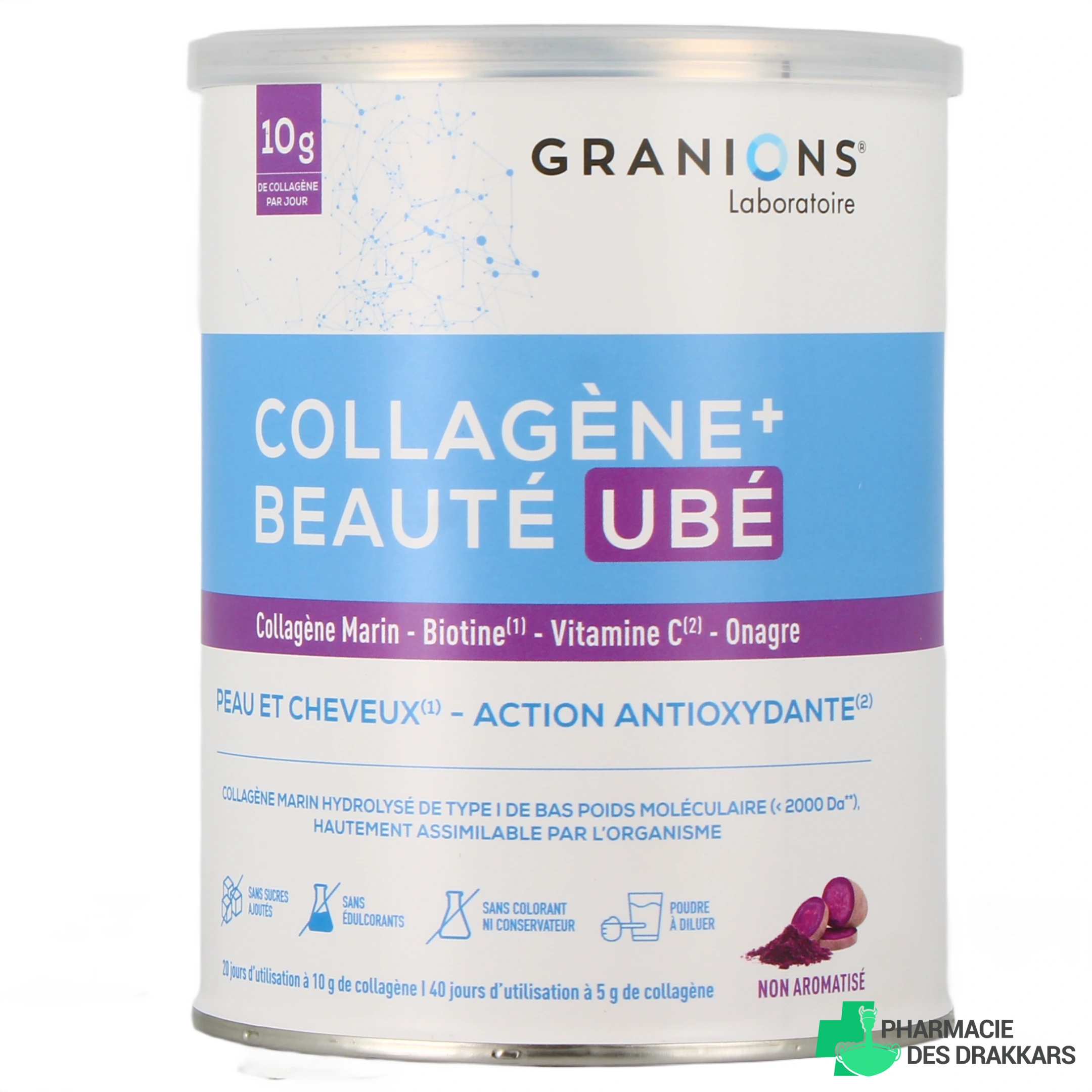 Vous pourrez retrouver le complément alimentaire Granions Collagène+ Beauté Ubé dans les présentations suivantes chez Pharmacie des Drakkars : pot de 216 g de poudre à diluer non aromatisée.