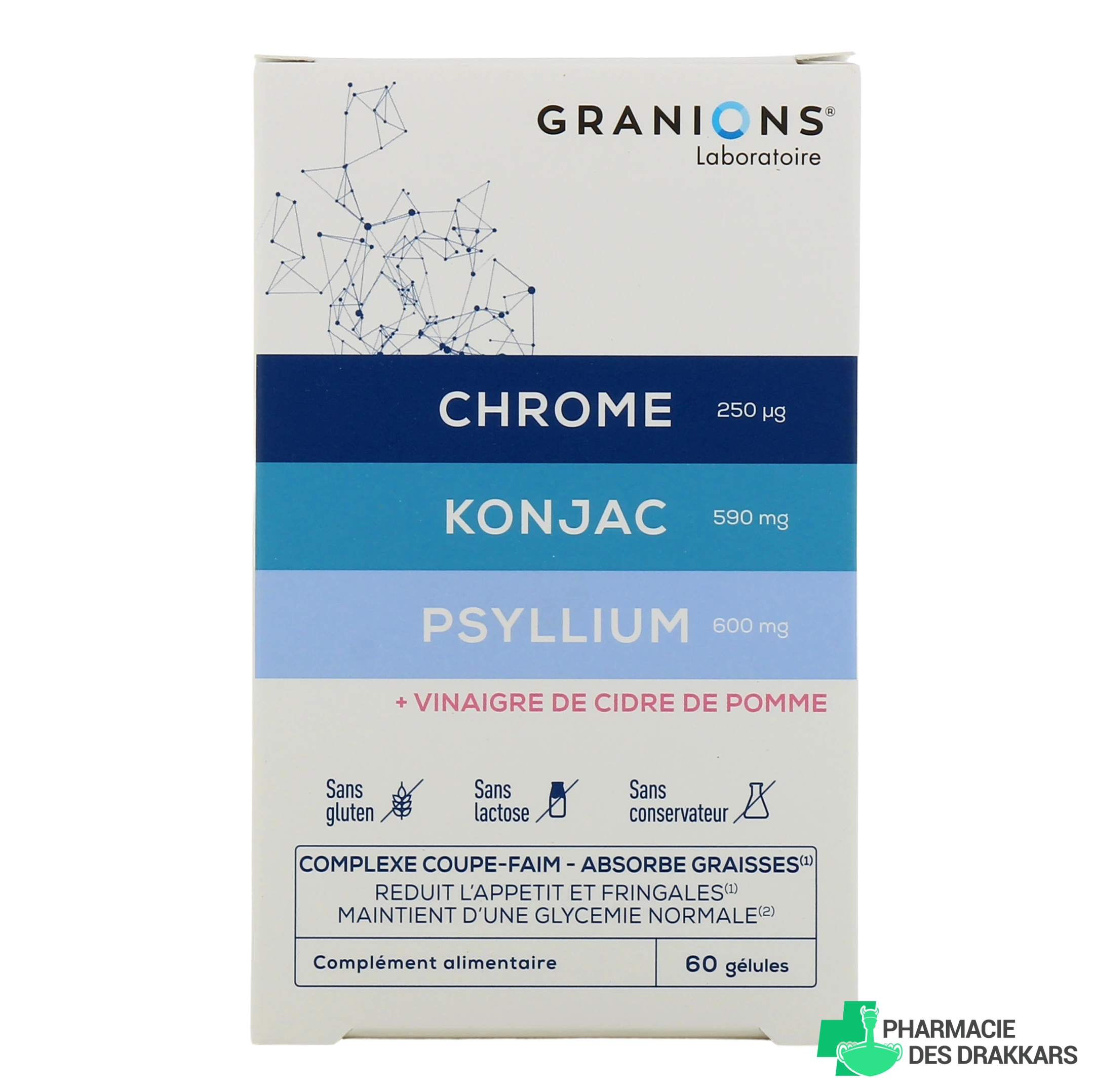Vous pourrez retrouver le complément alimentaire Complexe Coupe Faim de Granions dans les présentations suivantes chez Pharmacie des Drakkars : boîte de 60 comprimés.