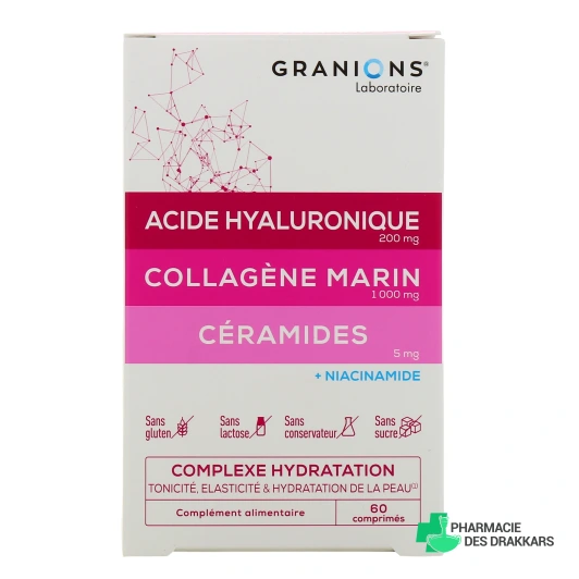 Vous pourrez retrouver le complément alimentaire Granions Complexe Hydratation Peau dans les présentations suivantes chez Pharmacie des Drakkars : boîte de 60 comprimés (programme d'un mois).