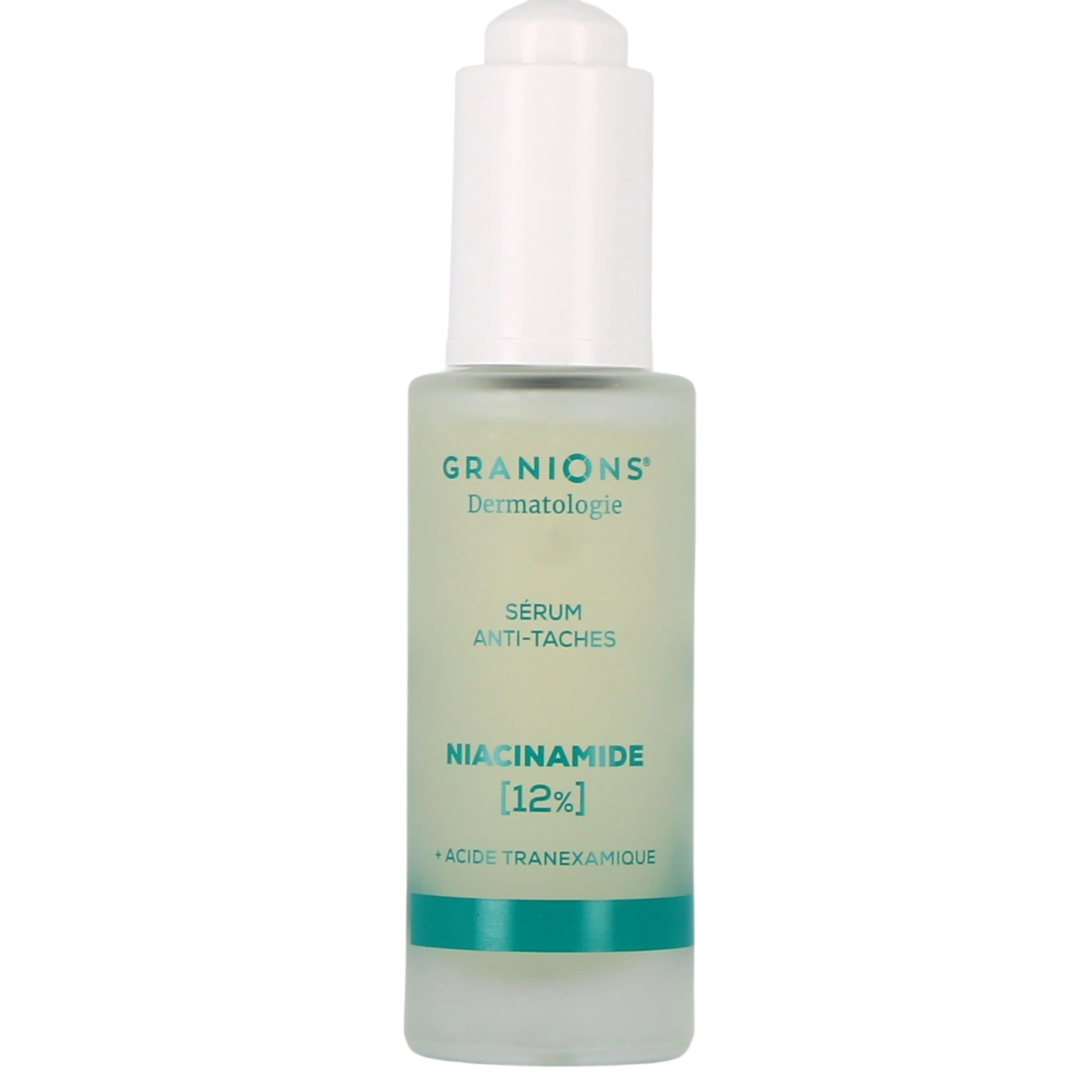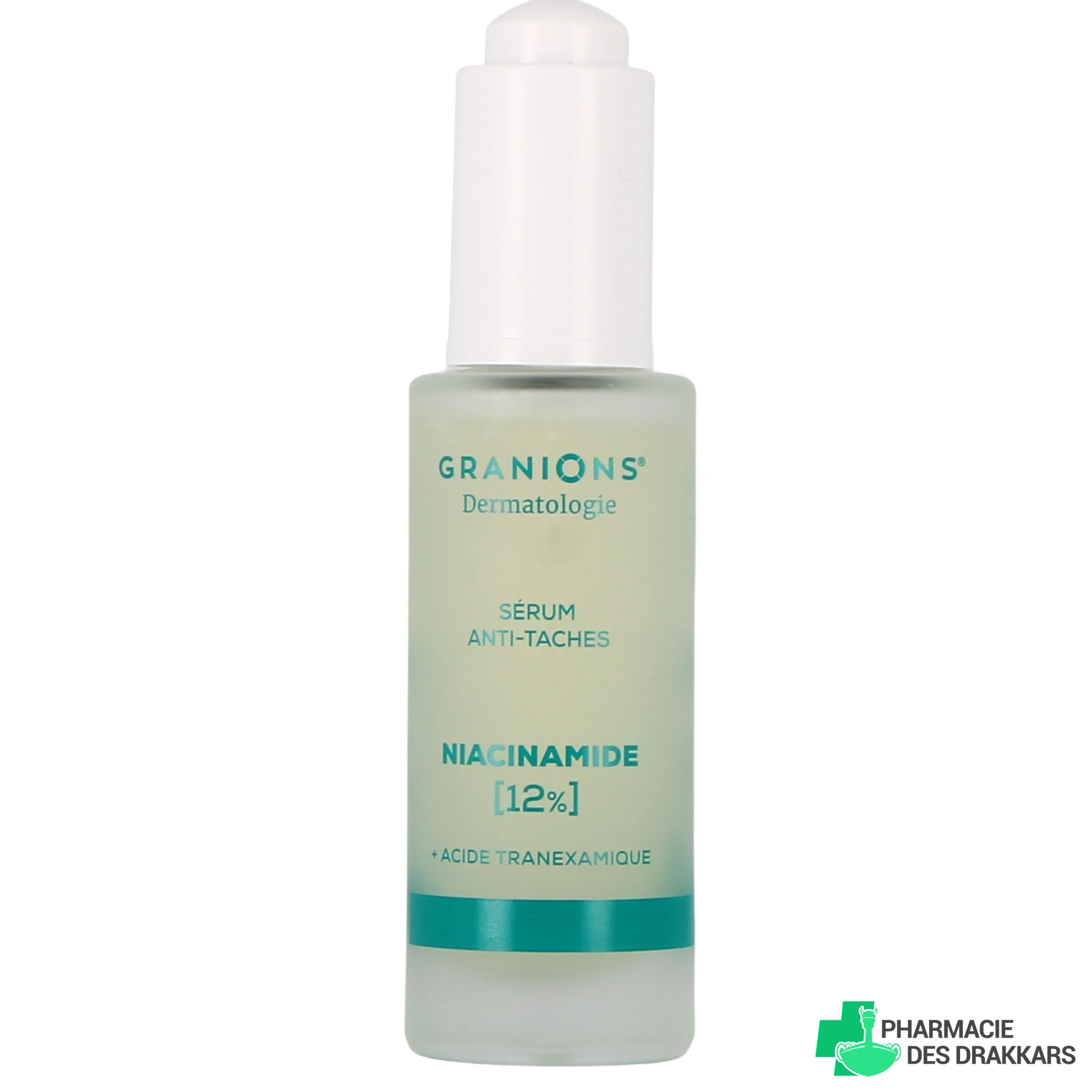 Présentation proposée sur la pharmacie en ligne des drakkars pour le sérum anti-taches Granions Dermatologie : flacon-pipette de 30 ml.