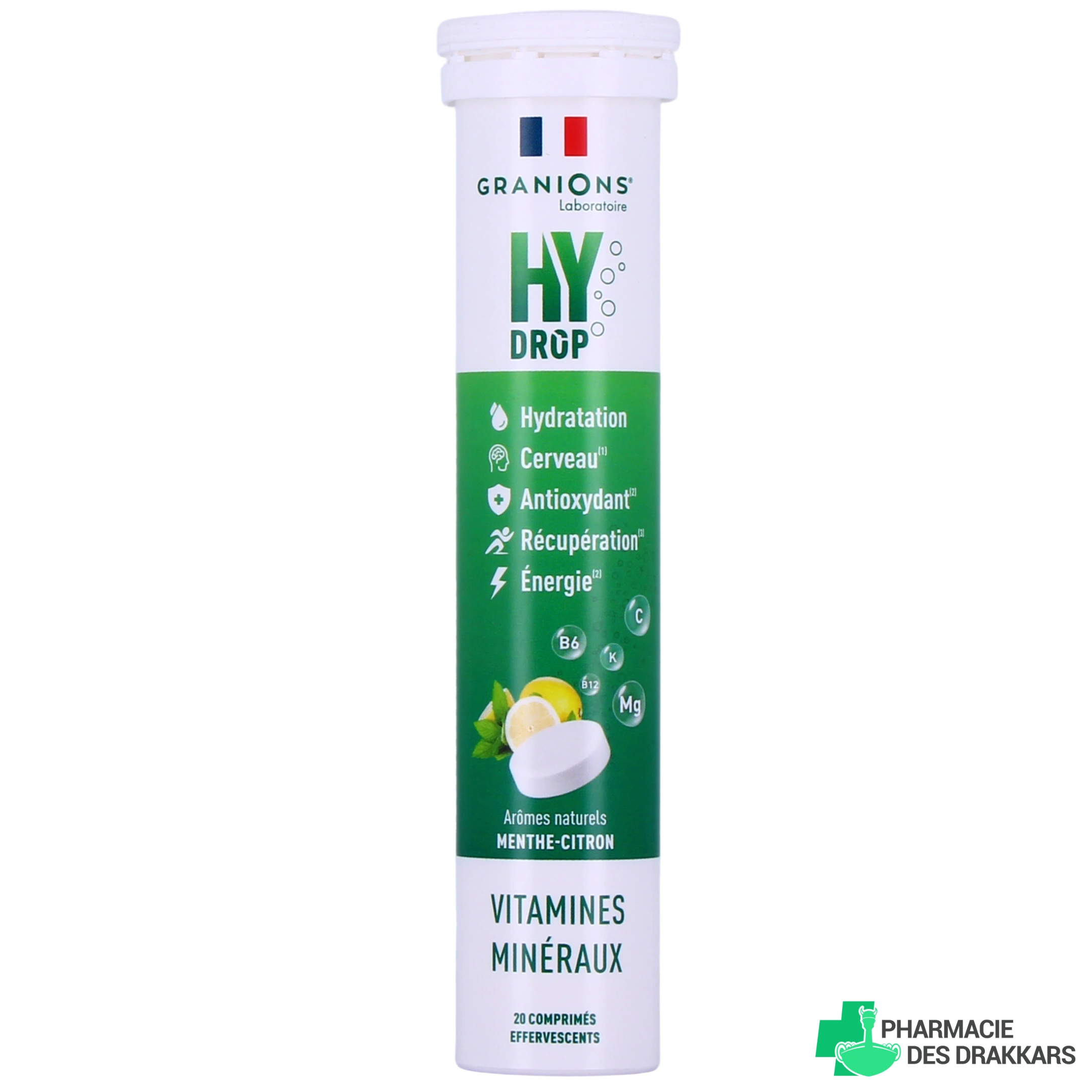Conditionnement proposé pour les pastilles hydratation Hydrop Granions sur notre pharmacie en ligne : tube de 20 comprimés effervescents, arôme au choix.
