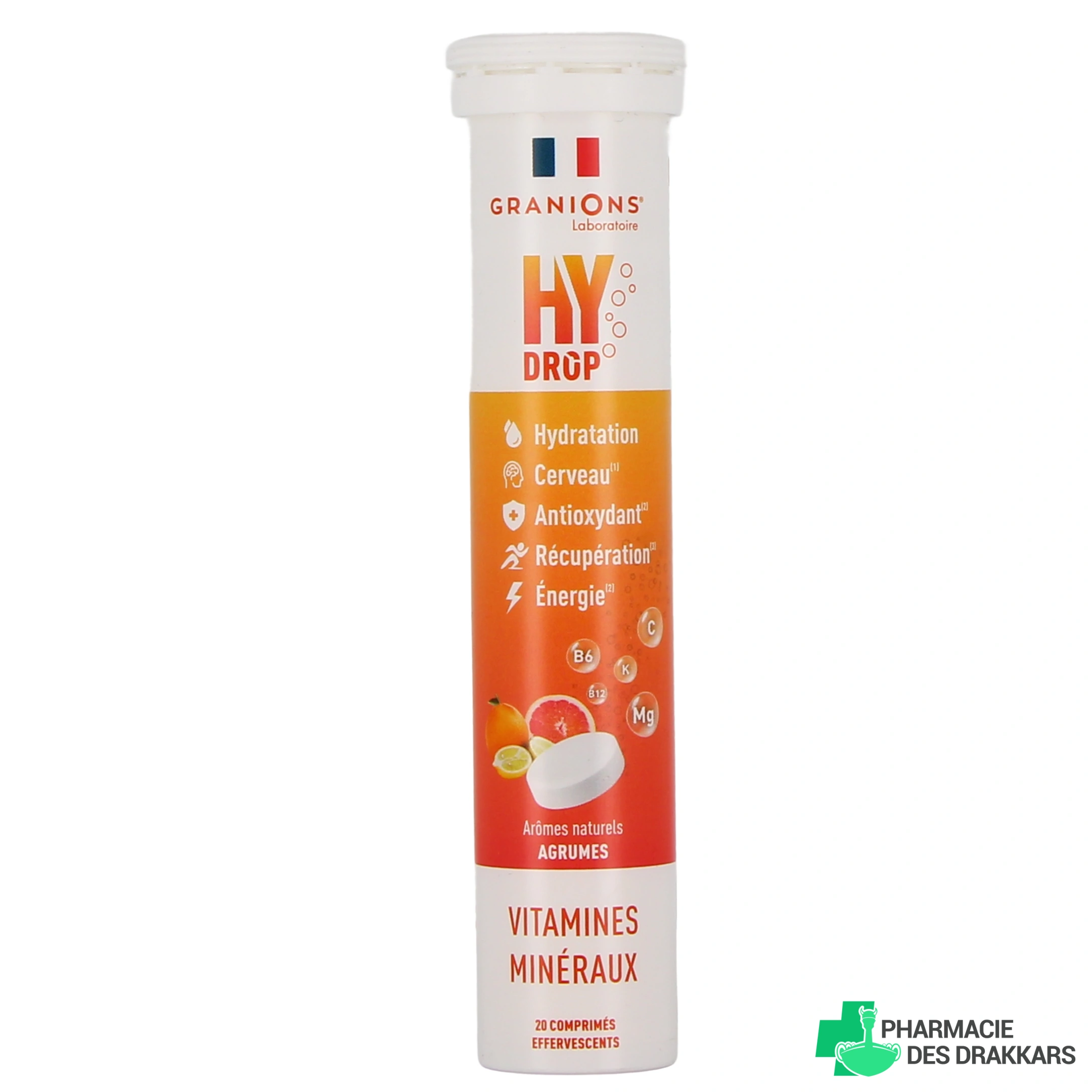 Conditionnement proposé pour les pastilles hydratation Hydrop Granions sur notre pharmacie en ligne : tube de 20 comprimés effervescents, arôme au choix.