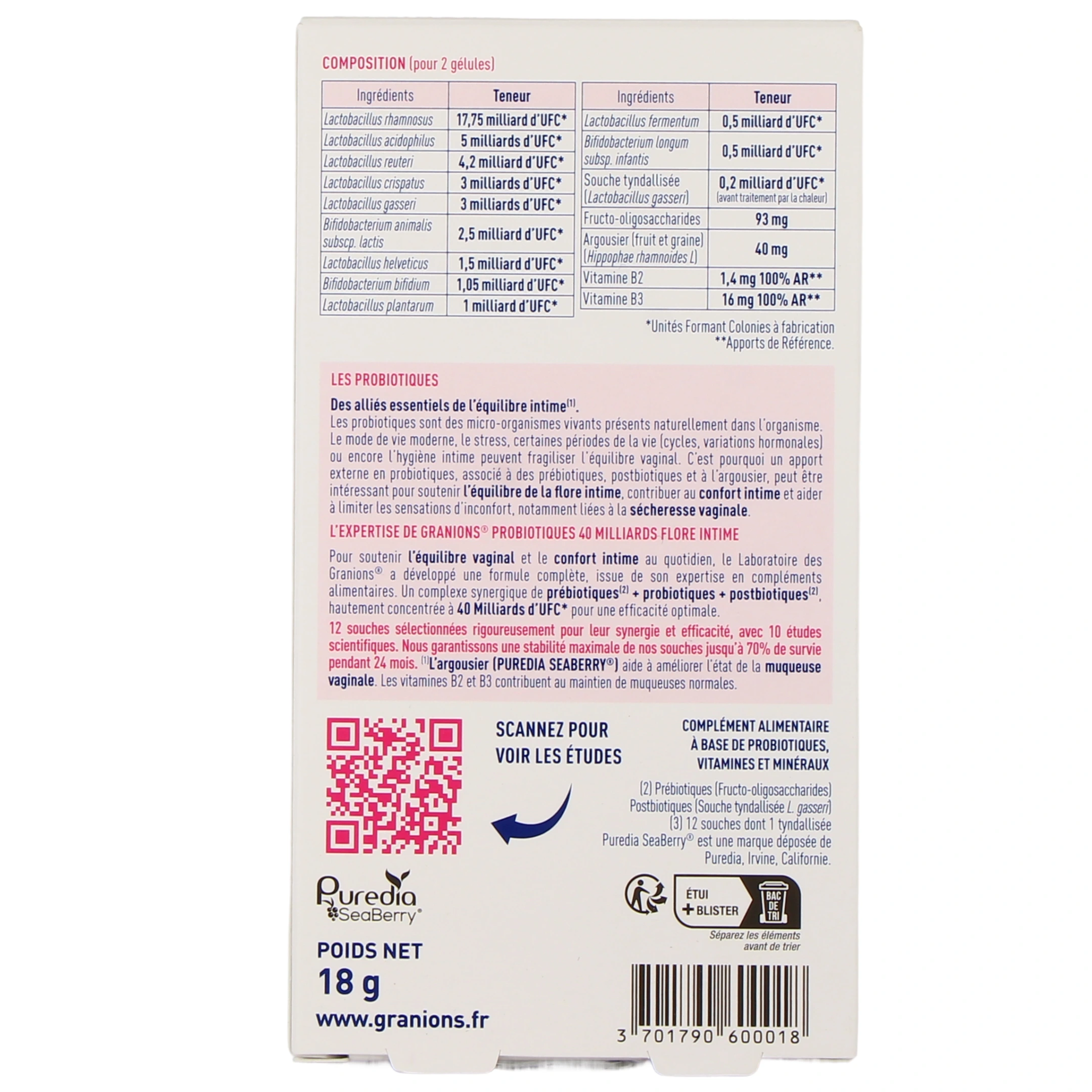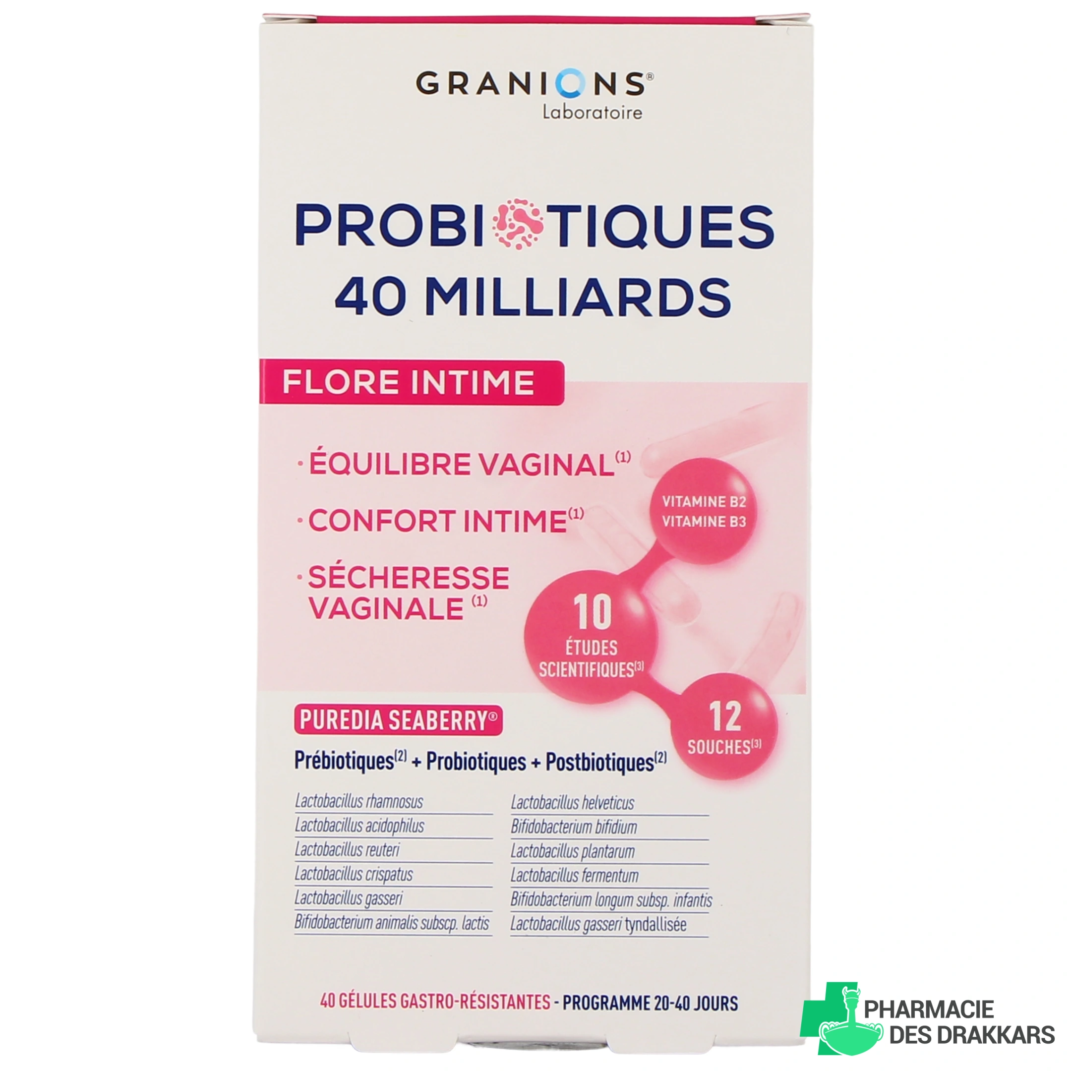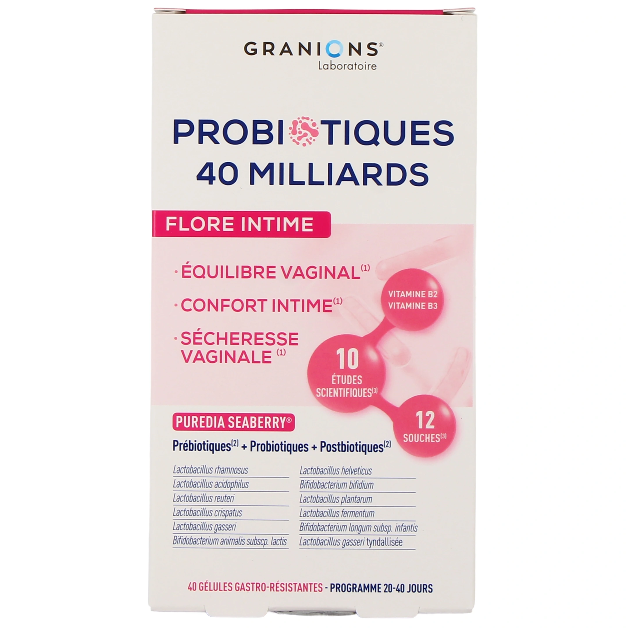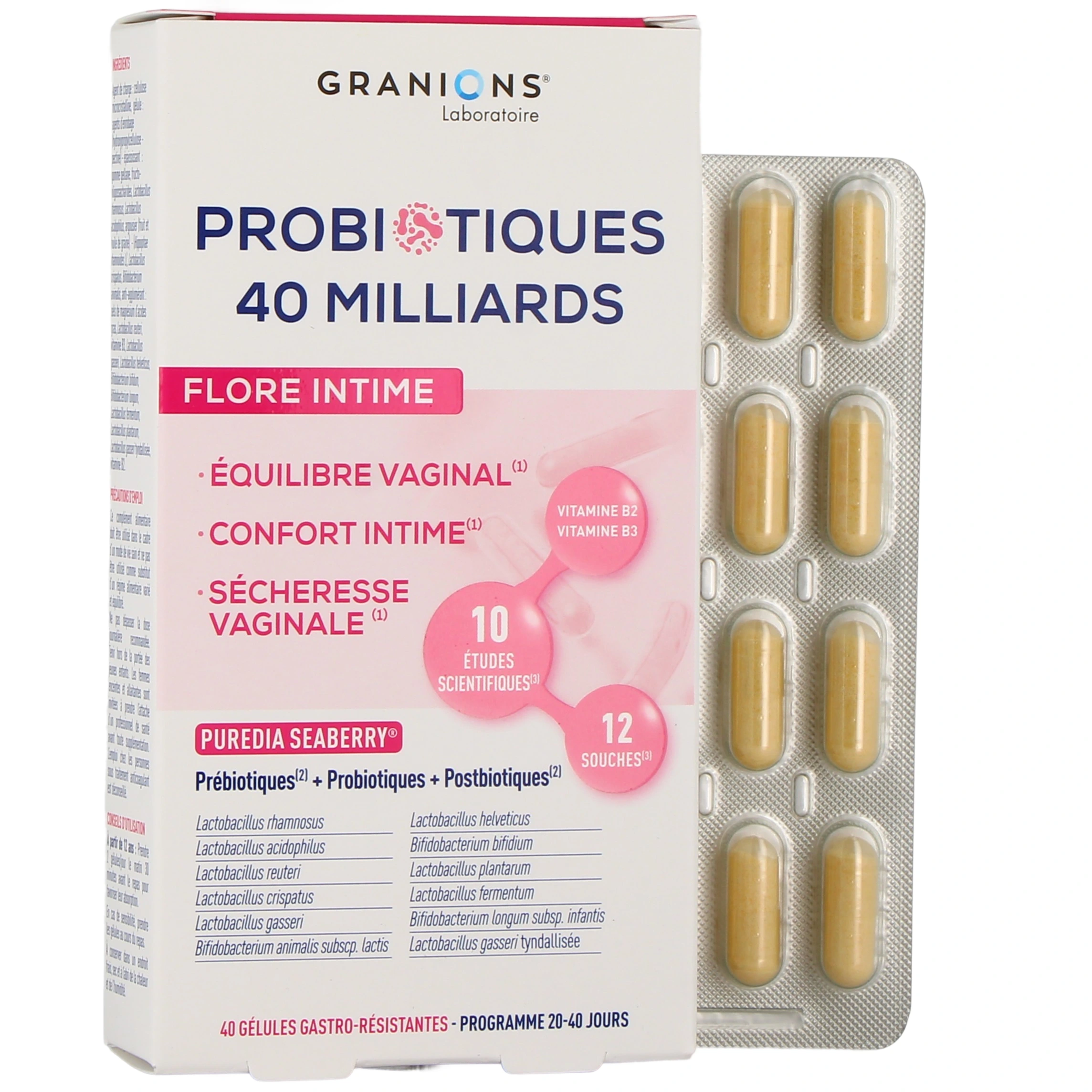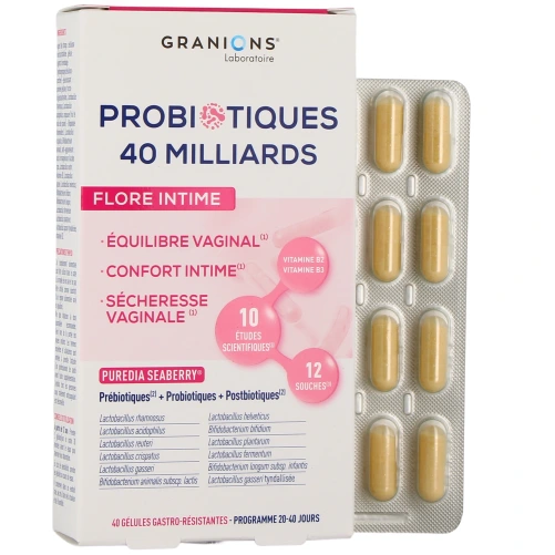Conditionnement disponible sur notre pharmacie en ligne pour Granions Probiotiques Flore Intime : boîte de 40 gélules gastro-résistantes (pour un programme de 20 à 40 jours).