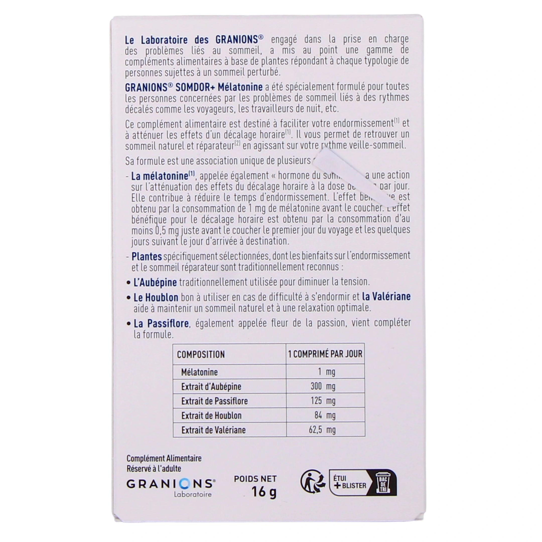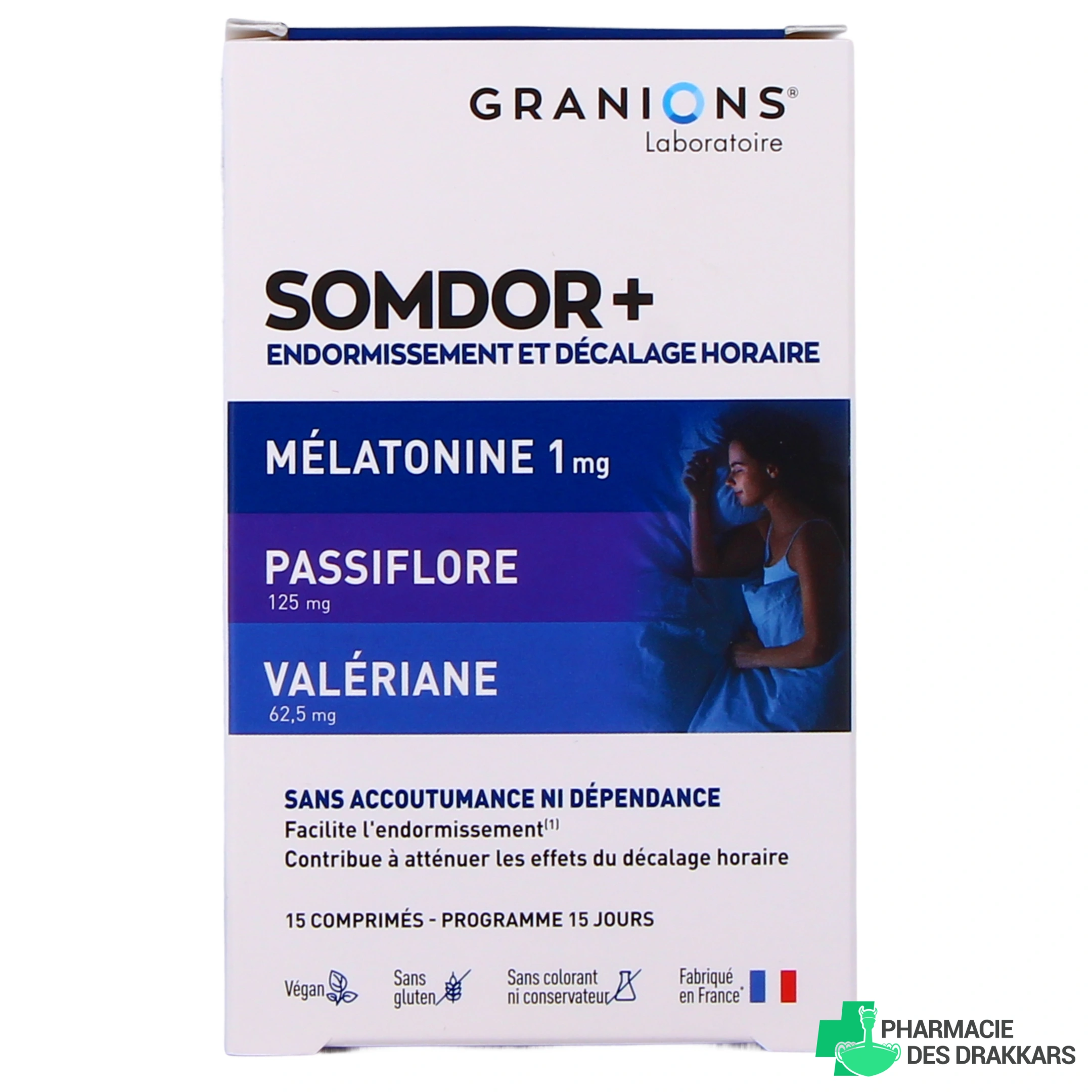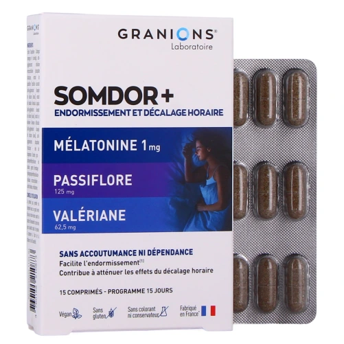 Le Laboratoire des Granions, engagé dans la prise en charge des problèmes liés au sommeil, a mis au point une gamme de compléments alimentaires à base de plantes répondant à chaque typologie de personnes sujettes à un sommeil perturbé. Ainsi, Granions Somdor+ Mélatonine a été spécialement formulé pour toutes les personnes concernées par les problèmes de sommeil liés à des rythmes décalés comme les voyageurs, les travailleurs de nuit... Ce complément alimentaire est destiné à faciliter votre endormissement et à atténuer les effets d'un décalage horaire. Il vous permet de retrouver un sommeil naturel et réparateur en agissant sur votre rythme veille-sommeil. Sa formule est une association unique de plusieurs actifs. La mélatonine, appelée également "hormone du sommeil", a une action efficace sur la régulation du rythme veille-sommeil et sur l'atténuation des effets du décalage horaire à la dose de 1 mg par jour. Elle contribue à réduire le temps d'endormissement. L'effet bénéfique est obtenu par la consommation de 1 mg de mélatonine avant le coucher.