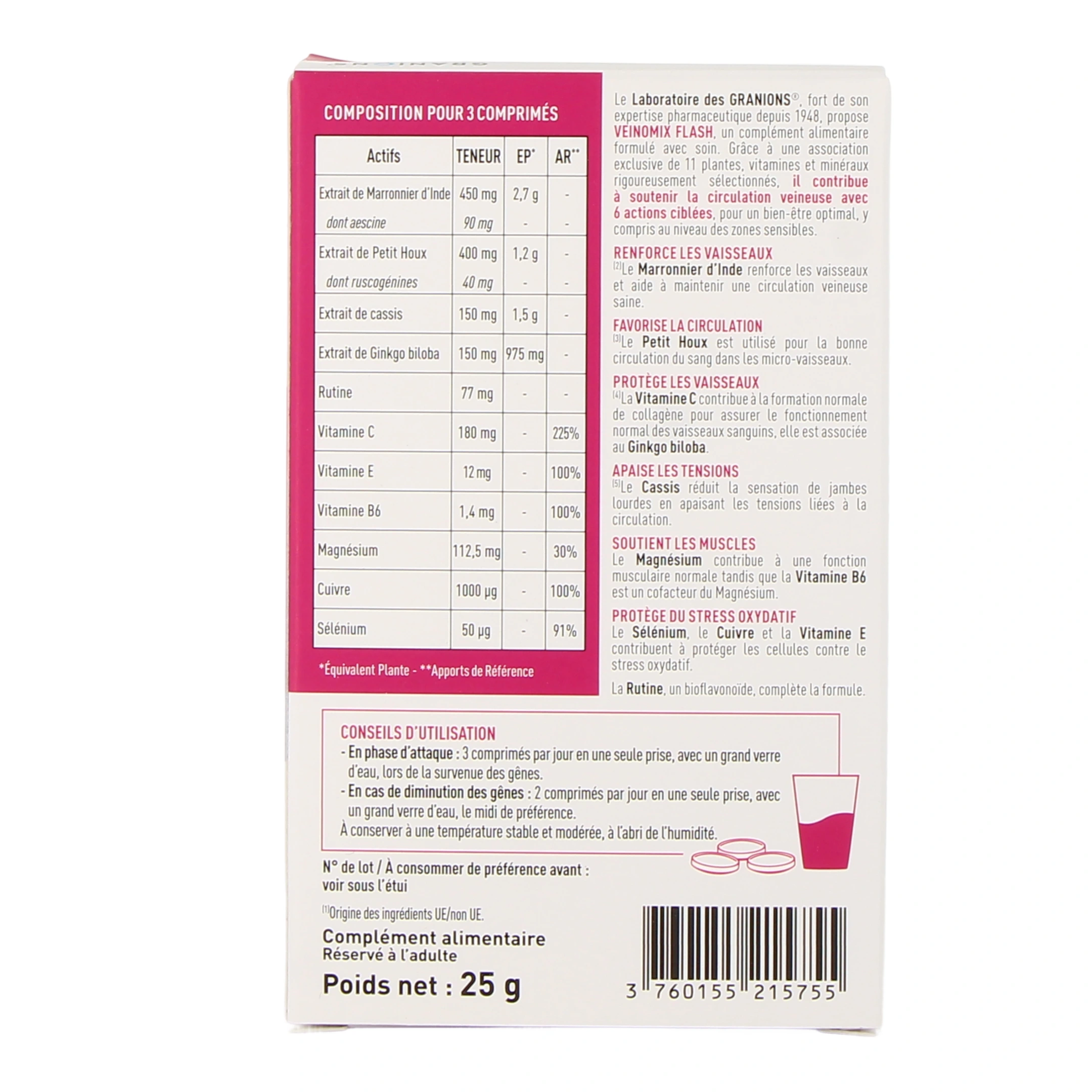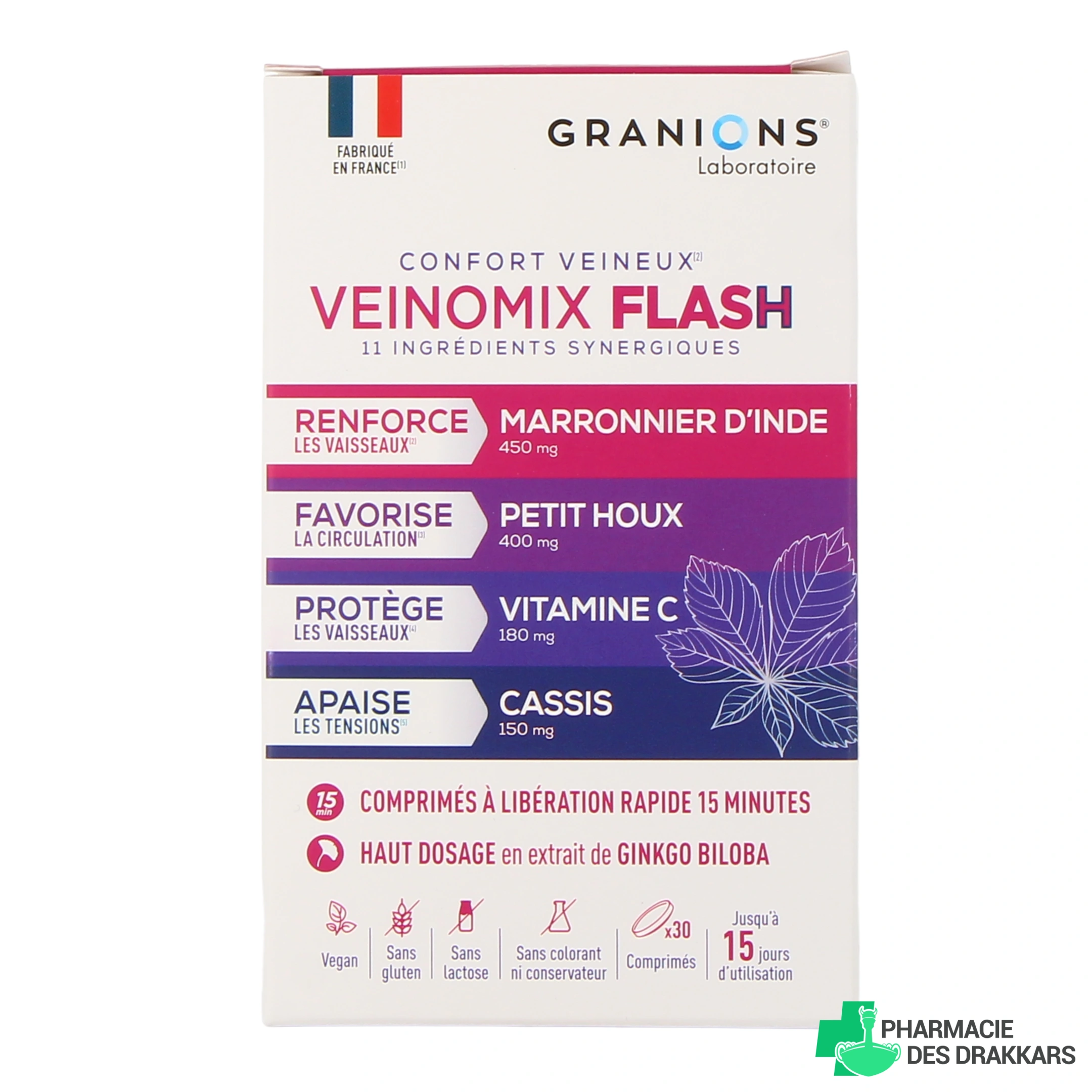 Le complément alimentaire Granions Veinomix Flash 1200 mg Circulation Veineuse se présente sous la forme de comprimés à libération rapide (moins de 15 minutes), et formulés à partir d'une synergie de plantes, de vitamines et de minéraux : marron d'Inde, Petit houx, cassis, ginkgo biloba, rutine, vitamine C, E et B6, magnésium, cuivre et sélénium.