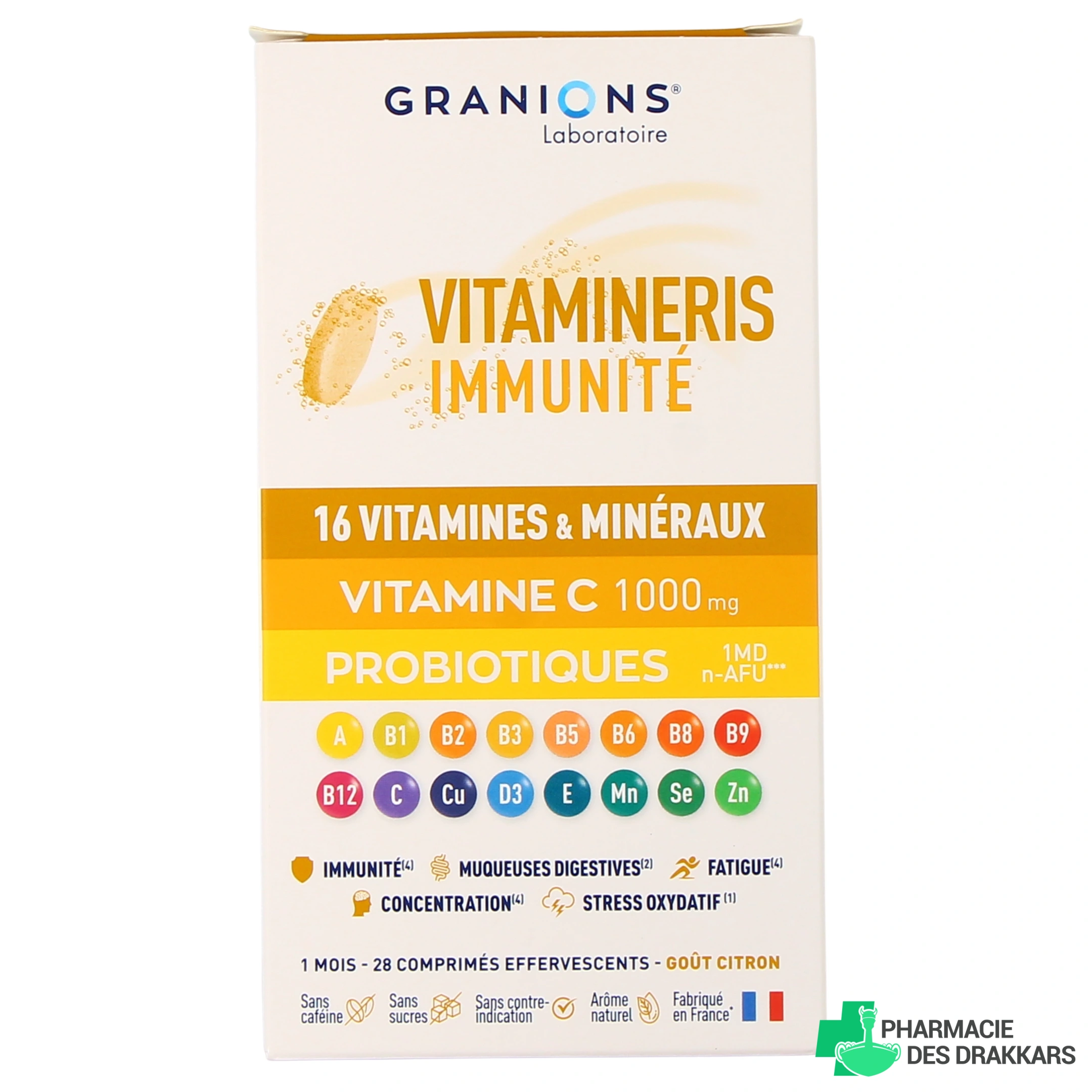 Vous pourrez sélectionner le complément alimentaire Granions Vitamineris Immunité 1000 mg parmi les présentations suivantes chez Pharmacie des Drakkars : boîte de 30 comprimés effervescents (pour un programme de 30 jours) goût citron.