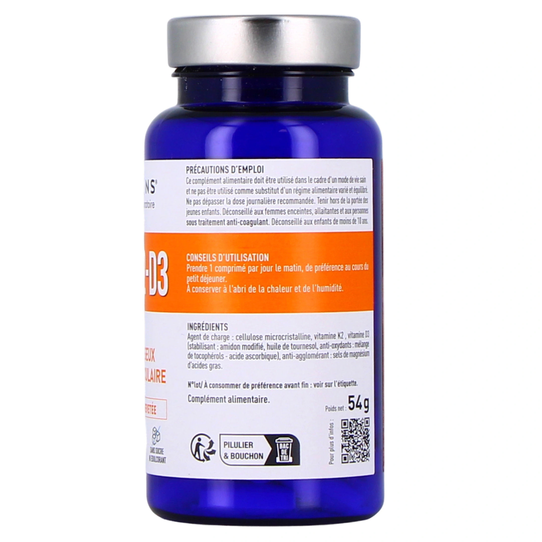 Granions Vitamine K2 D3 est un complément alimentaire à base de vitamines D3 d'origine végétale issue du lichen, associée à une vitamine K2 MK-7 all-trans brevetée. La vitamine D3 (vitamine D3 végétale 2000 UI) contribue au fonctionnement normal du système immunitaire et au maintien d'une ossature normale. La vitamine K contribue à une coagulation sanguine normale. La formule des comprimés de Granions Vitamine K2 D3 est par ailleurs garantie vegan, sans gluten, sans colorant ni conservateur, sans sucre ni édulcorant. Son utilisation est indiquée chez l’adulte et chez l’enfant âgé de plus de 10 ans uniquement, et convient particulièrement aux seniors, aux femmes ménopausées, aux personnes ayant une carence en vitamine D ou en calcium, ou encore à celles qui souhaitent renforcer leur système immunitaire et leur bien-être général.