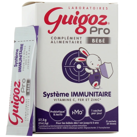 Vous pourrez retrouver le complément alimentaire Guigoz Pro Bébé Système Immunitaire dans les présentations suivantes chez Pharmacie des Drakkars : boîte de 21 sachets (21 doses, 1 sachet par jour).