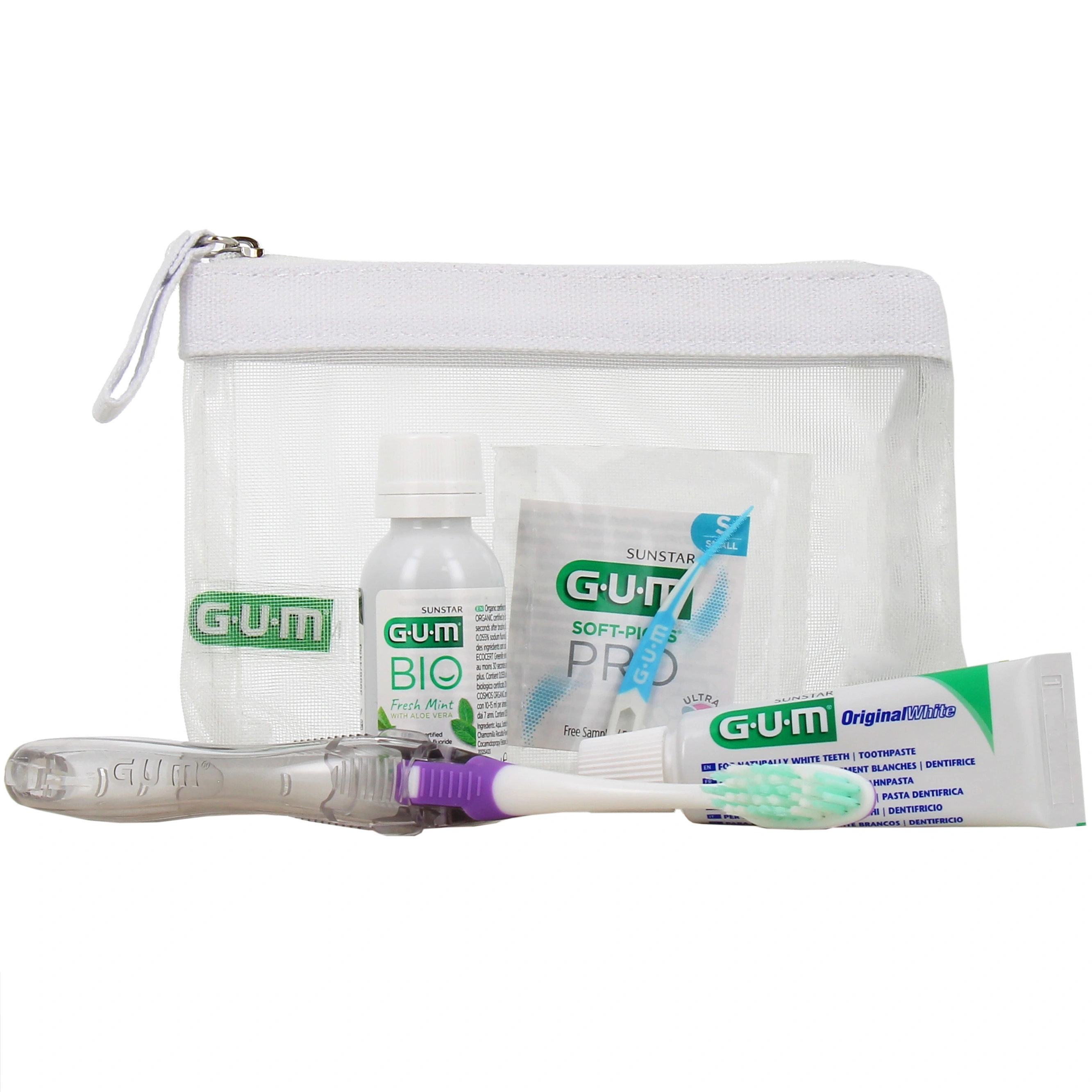 Le kit de voyage blancheur Gum contient le nécessaire pour une hygiène orale parfaite durant vos vacances, dans une trousse pratique et de petite taille, facile à emporter.