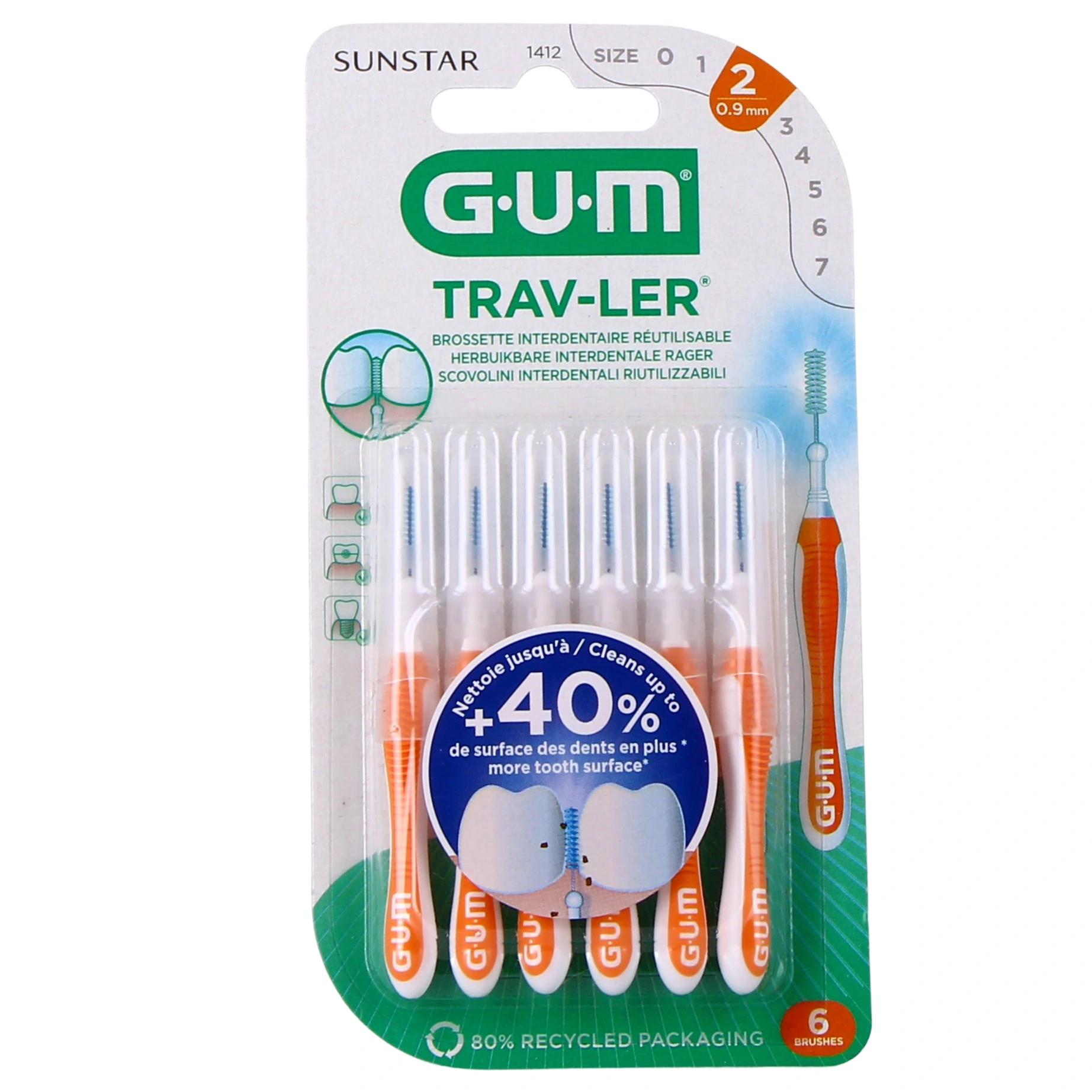 Conditionnement proposé par la Pharmacie des Drakkars pour les brossettes interdentaires Gum Traver-ler : ISO 1312 - 1314 - 1412 - 1414 - 1512 - 1514 - 1612 - 1614 - 1618 - 1619 ; pack de 4 ou 6 brossettes interdentaires.