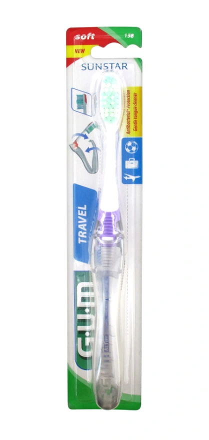La brosse à dents Gum Travel est une brosse à dents manuelle souple dont le design se compose de 3 parties : la tête et le cou de la brosse se replient dans le manche pour une grande praticité et pour vous permettre de l'emporter partout avec vous, que ce soit pendant un week-end, vos vacances ou tout simplement pour vous brosser les dents après le repas de midi au bureau.