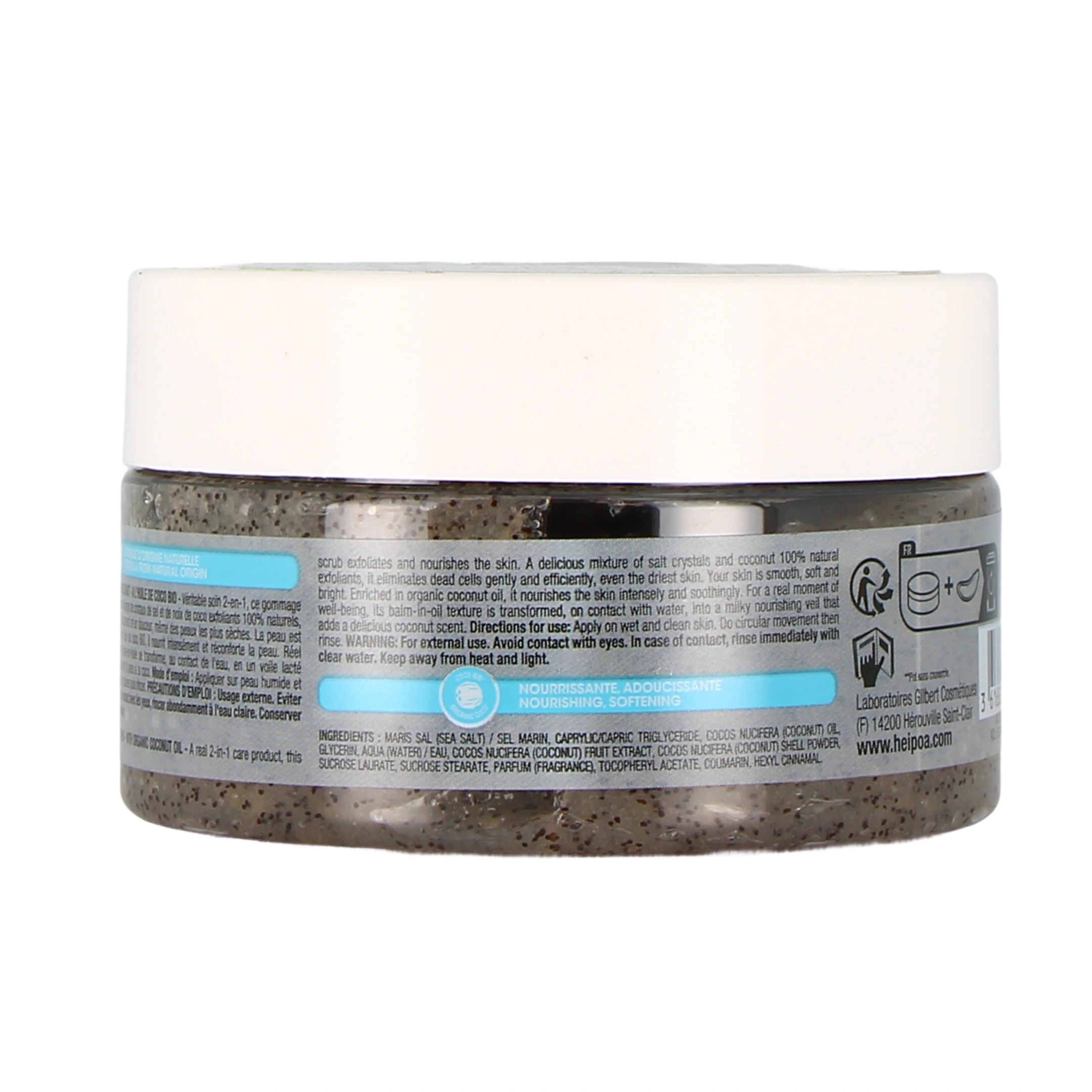 Le gommage gourmand nourrissant Hei Poa contient des exfoliants 100 % naturels, à savoir des cristaux de sel, de la pulpe et des coques de noix de coco. Ces actifs vont exercer un gommage mécanique et faire disparaître les cellules mortes à la surface de la peau. L'huile de noix de coco bio apporte ses propriétés nourrissantes, adoucissantes et régénérantes.