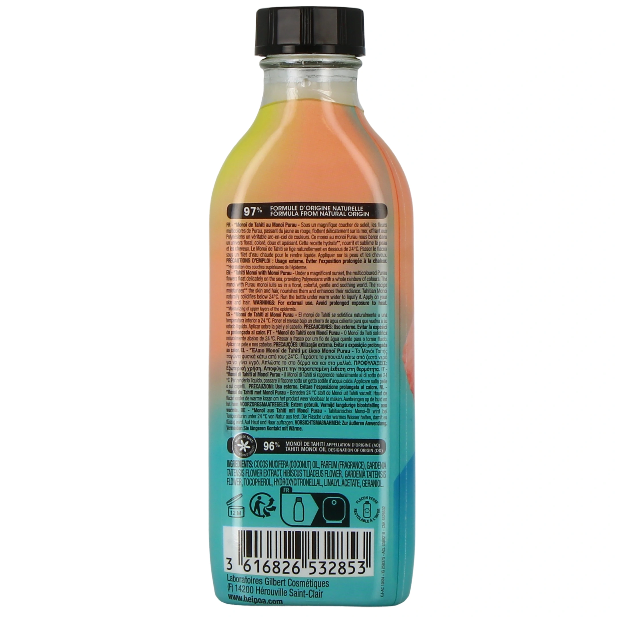 Fabriqué en France, ce soin est doté d'une composition très pure, avec 97 % d'ingrédients d'origine naturelle. Il contient notamment 96 % de Monoï de Tahiti bénéficiant de l'Appellation d'Origine (AO), un label qui assure le respect des traditions polynésiennes et soutient l'économie locale. Le Monoï Collection Sunset Flower Hei Poa est un soin multi-usages conçu pour sublimer aussi bien l'épiderme que la chevelure :