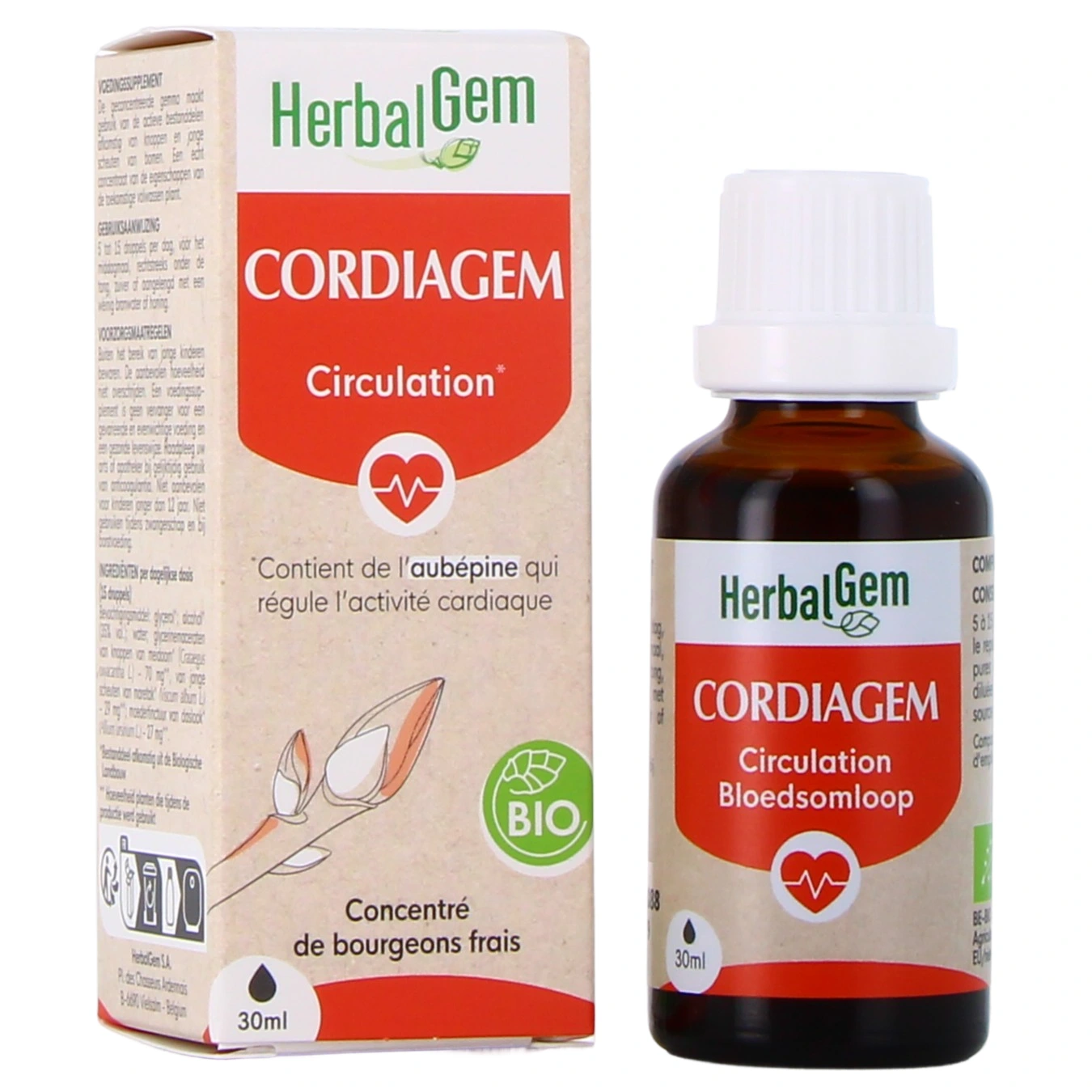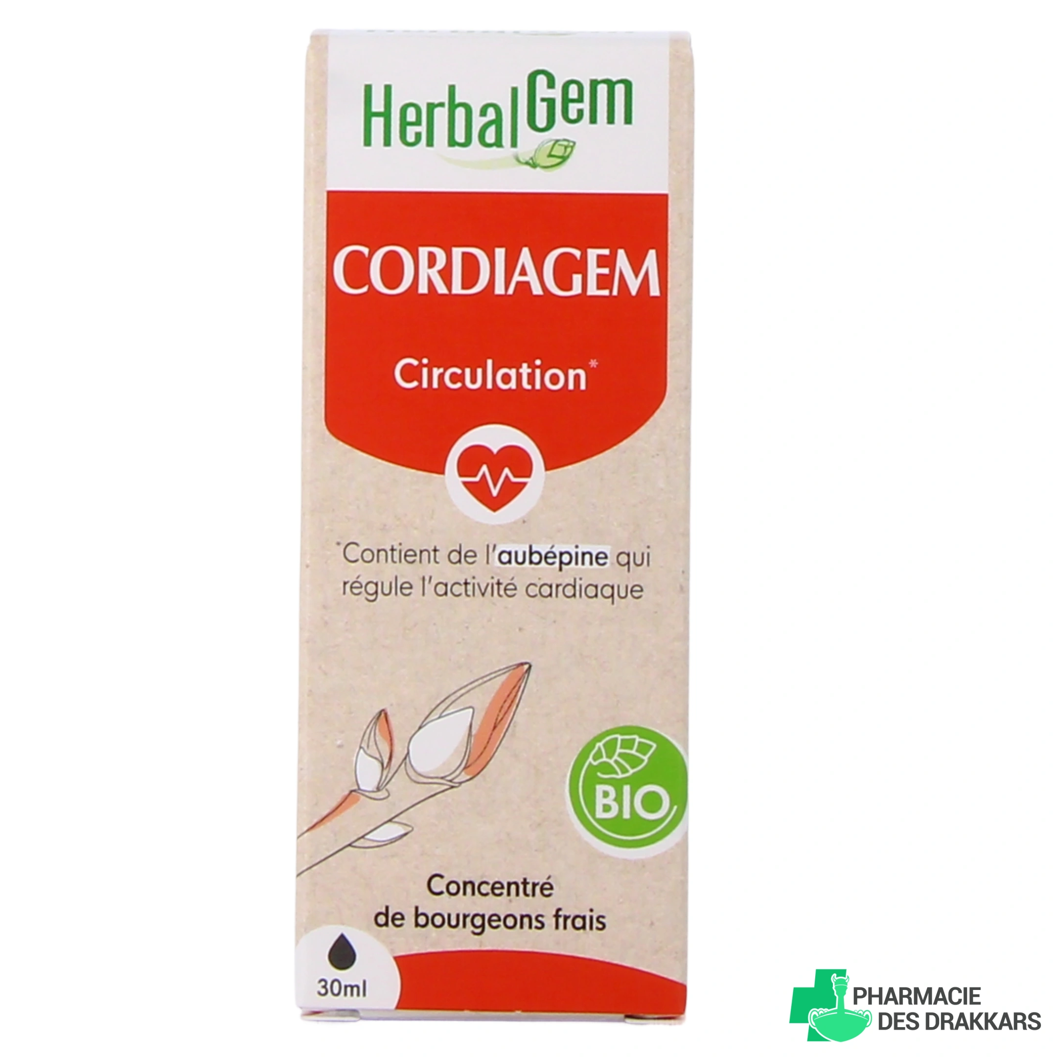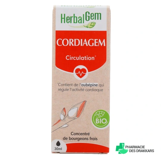 La gemmothérapie concentrée utilise les actifs issus de bourgeons et jeunes pousses d'arbres, véritable concentré des propriétés de la future plante adulte. Pour concocter Cordiagem, la marque Herbalgem a sélectionné un macérat glycériné de bourgeons d'aubépine (70 mg par dose journalière) et l'a associé à de la teinture mère d'ail des ours (27 mg par dose journalière). Cordiagem Herbalgem, grâce à l'aubépine, régule l'activité cardiaque.
