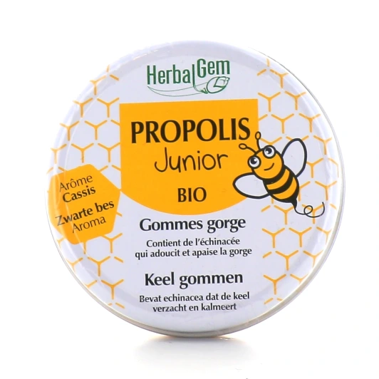 Formulées avec des teintures mères de propolis et d'échinacée, les gommes gorge Propolis Junior Bio proposées par Herbalgem conviennent aux enfants dès l'âge de 6 ans, et contribuent à adoucir et apaiser la gorge.