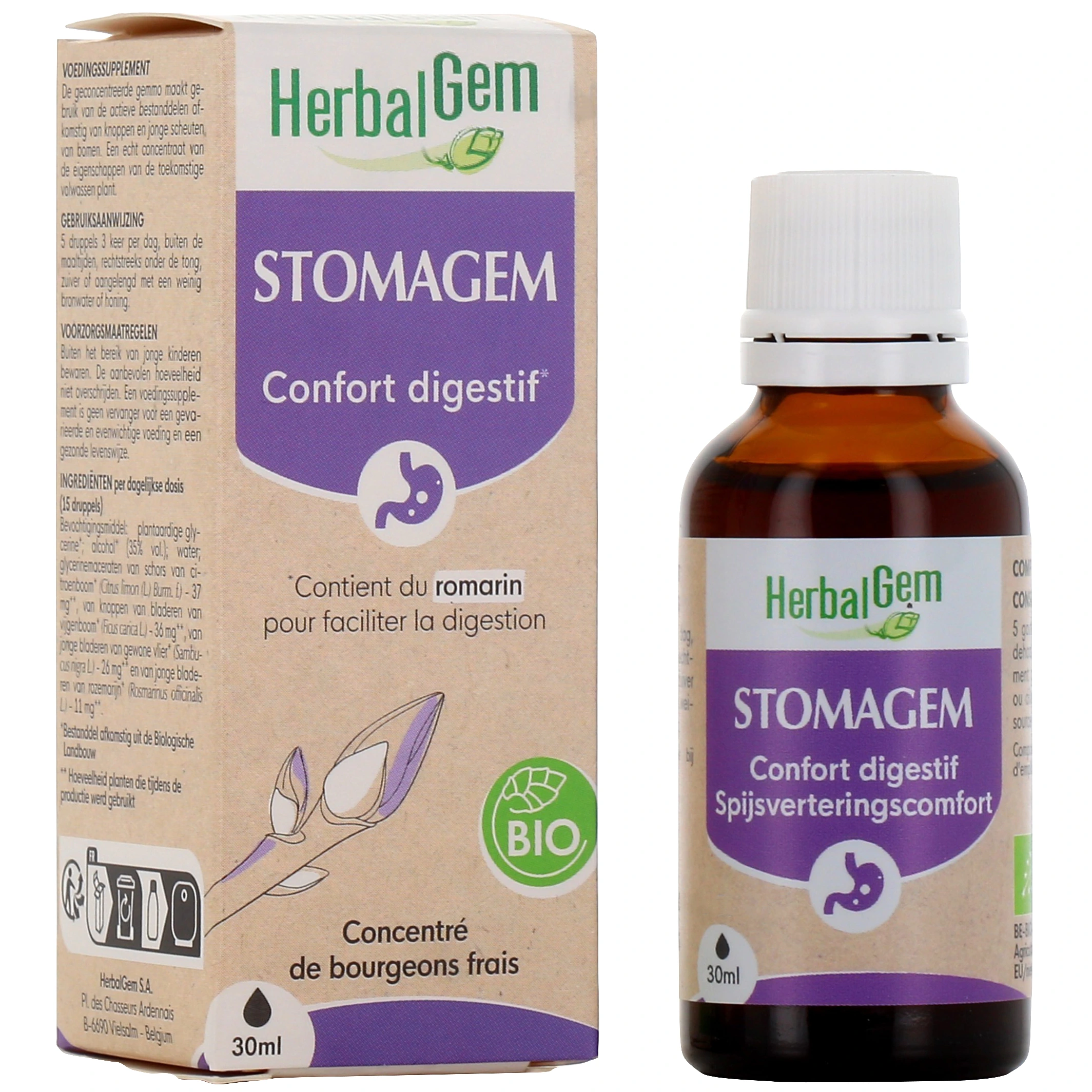 Herbalgem Stomagem Bio Confort Digestif est un complément alimentaire issu de la gemmothérapie. Il est décliné en spray buccal et en gouttes.