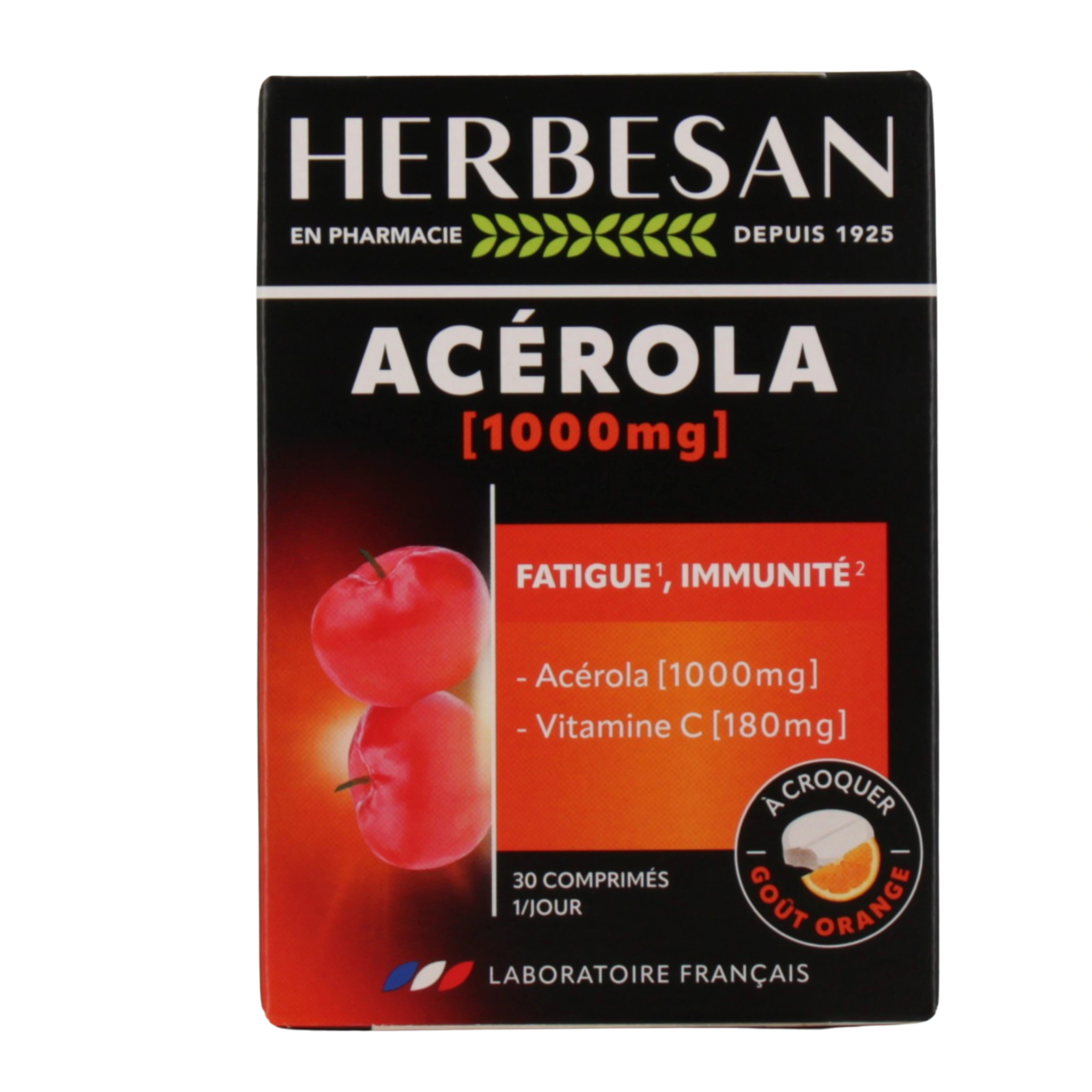 Acérola Vitamine C est un complément alimentaire au délicieux goût d'orange proposé sous forme de comprimés à croquer.