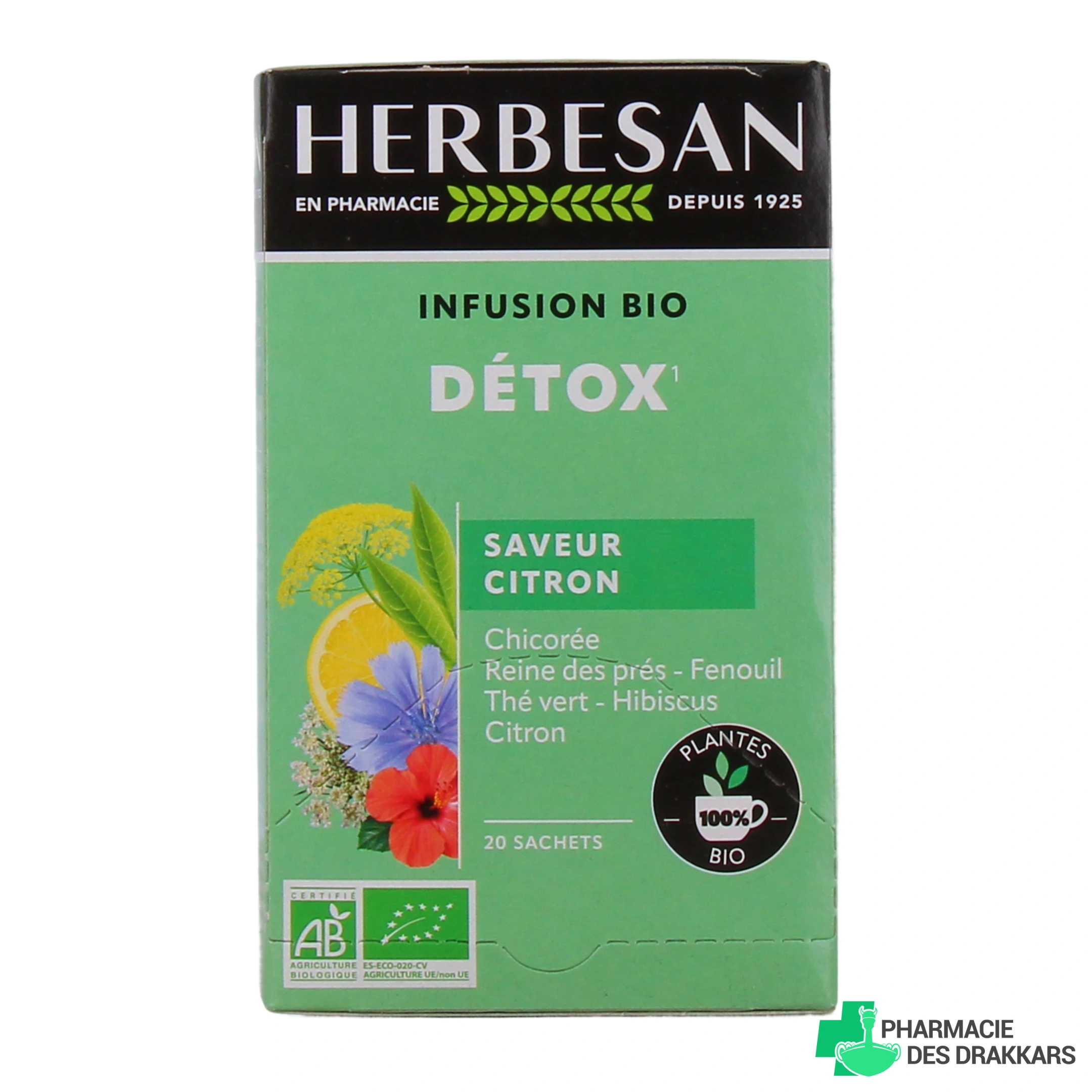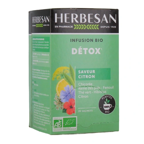 Présentation proposée pour l'infusion bio Détox Herbesan sur notre pharmacie en ligne : Boîte de 20 sachets