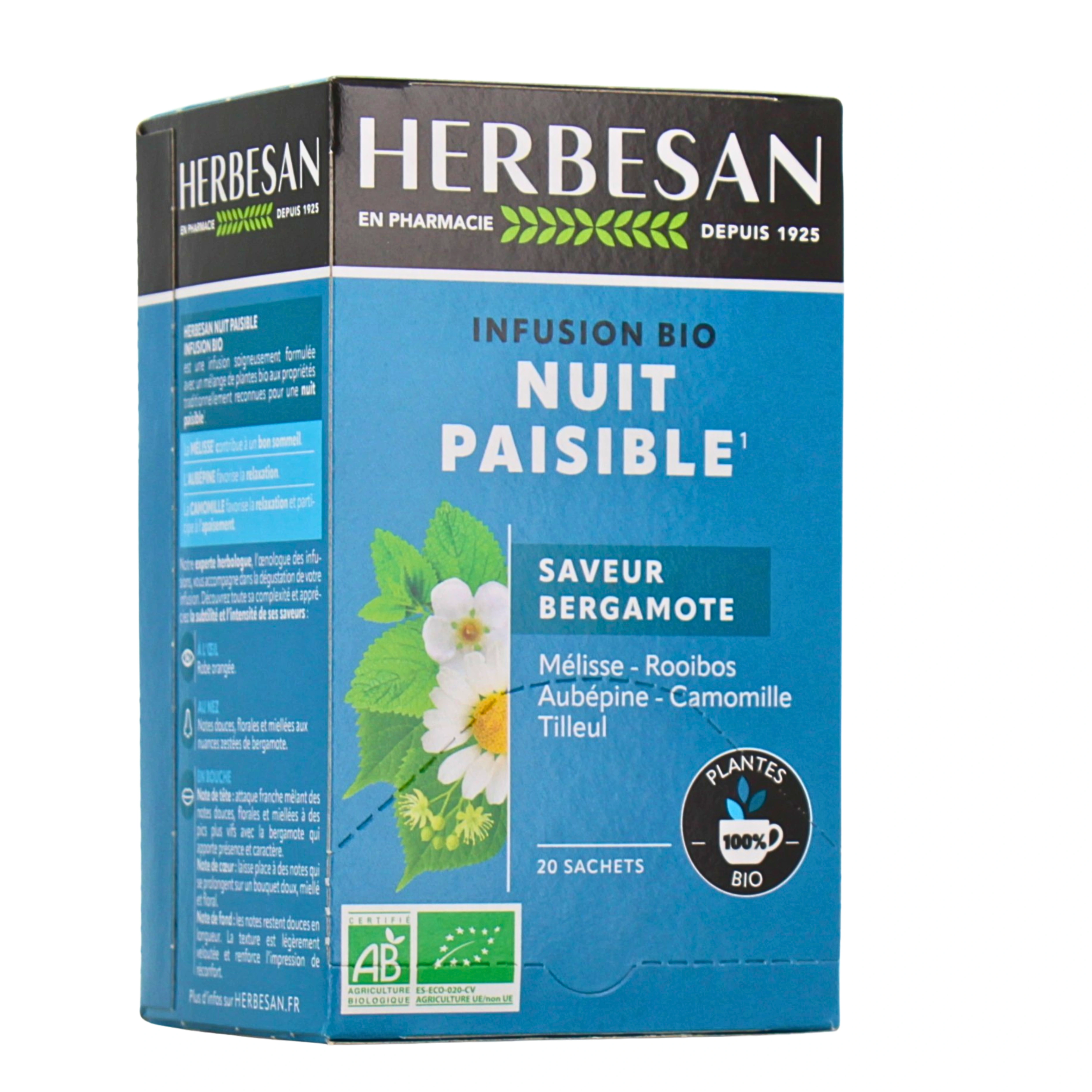 L'infusion bio Nuit Paisible de la marque Herbesan est une préparation à base de 5 plantes issues de l'agriculture biologique. Elle contient notamment de la camomille, qui contribue à une nuit paisible.