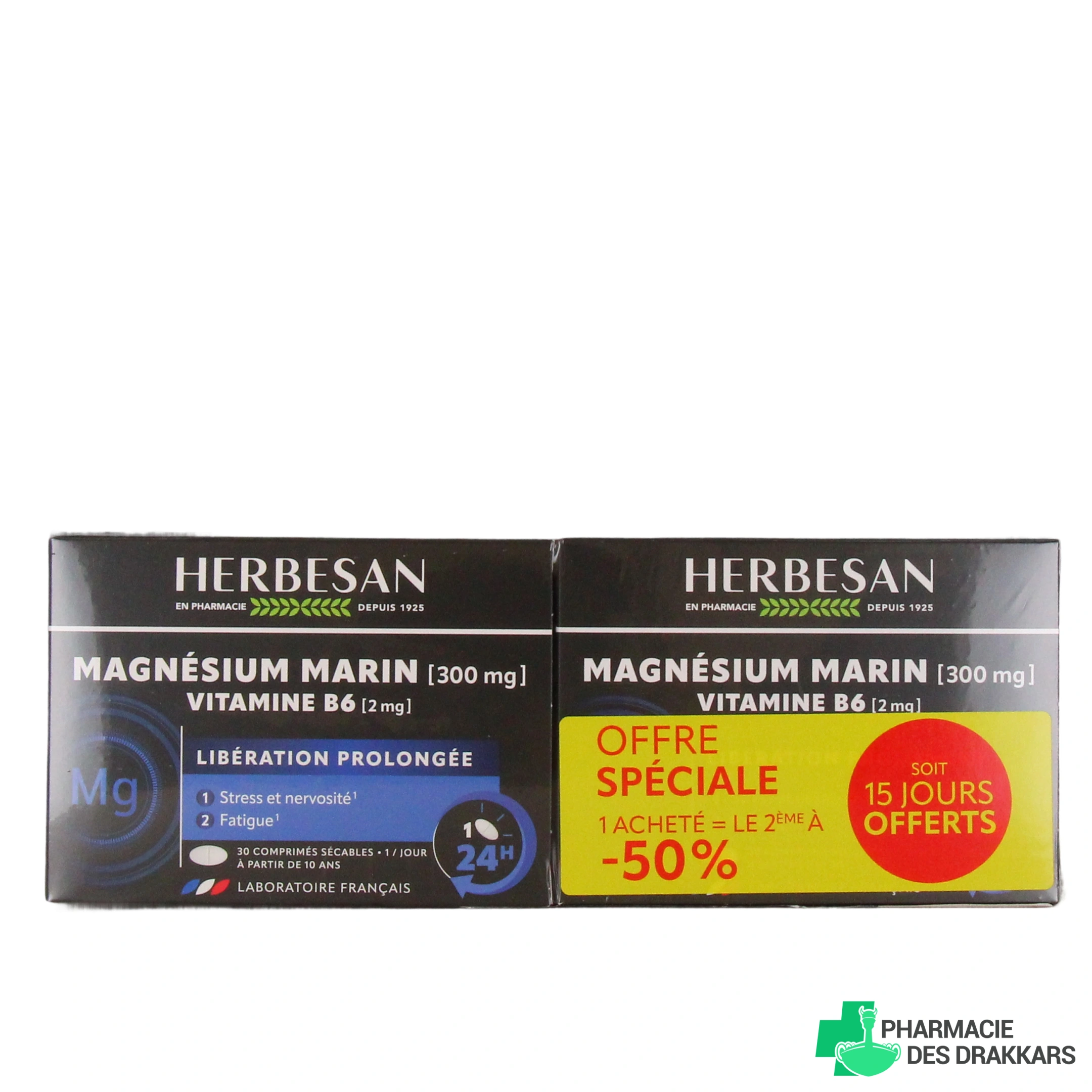 Vous pourrez sélectionner le complément alimentaire Herbesan Magnésium Vitamine B6 LP parmi les présentations suivantes chez Pharmacie des Drakkars : boîte de 30 comprimés à libération prolongée ou lot de 2x 30 comprimés à libération prolongée (1 / jour).