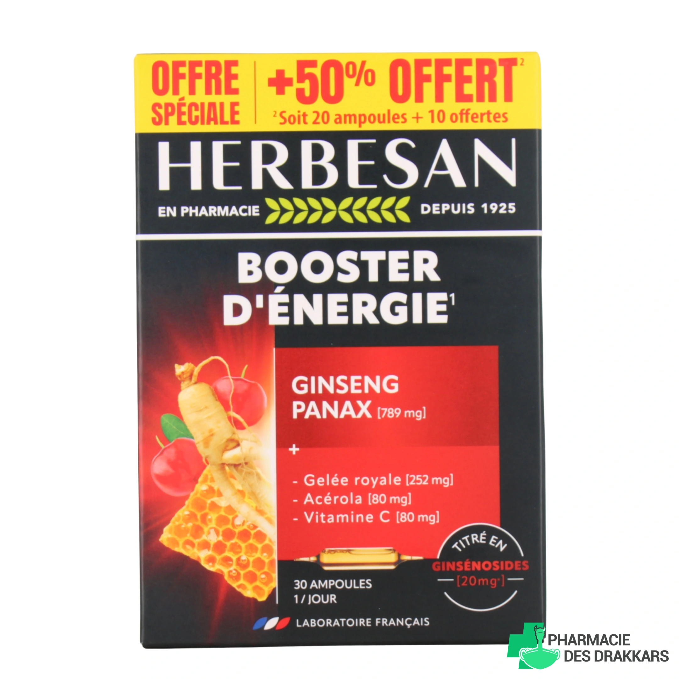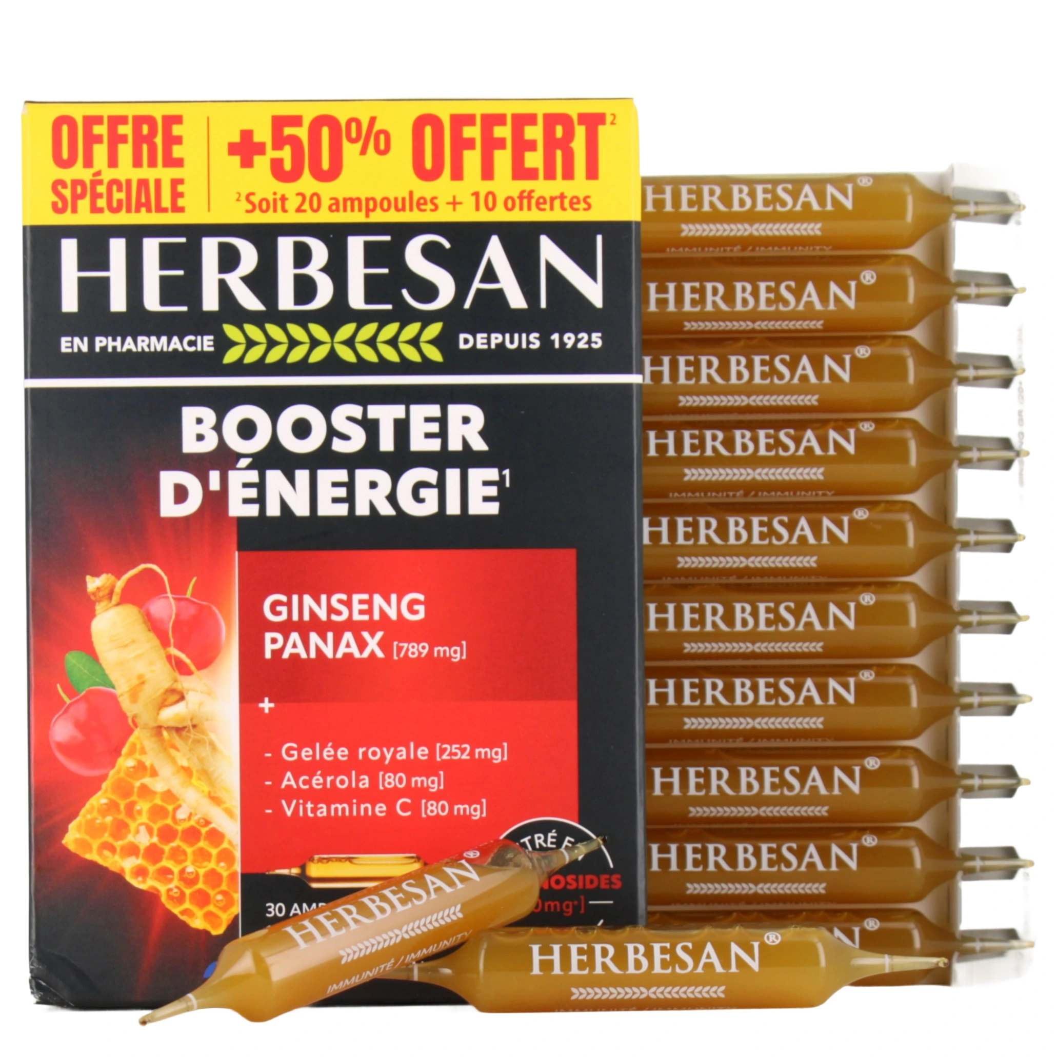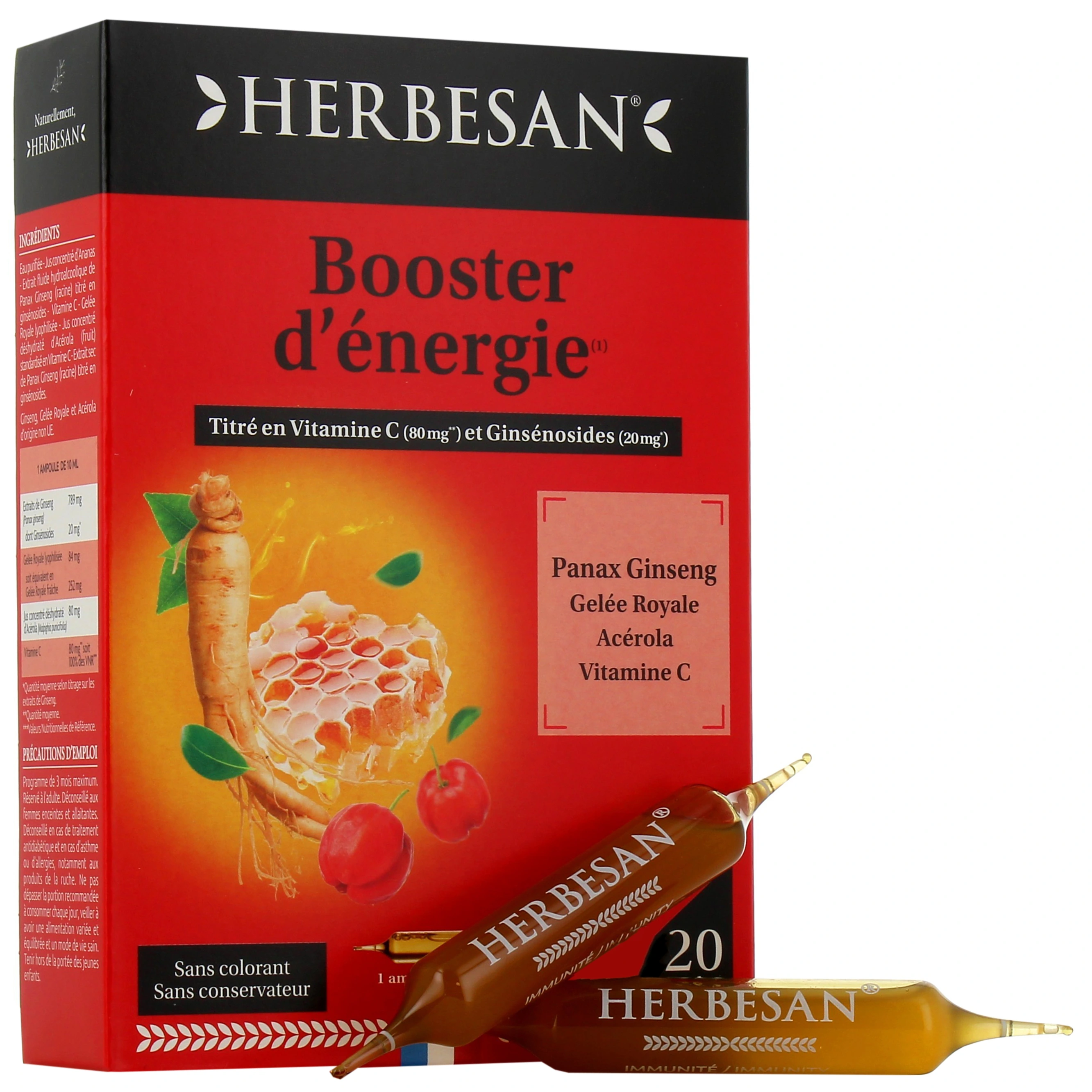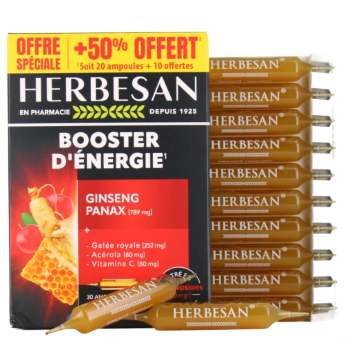 Présentation proposée par votre pharmacie en ligne pour Herbesan Panax Ginseng Tonus et Énergie : Boîte de 20 ampoules buvables de 15 ml - programme de 20 jours.