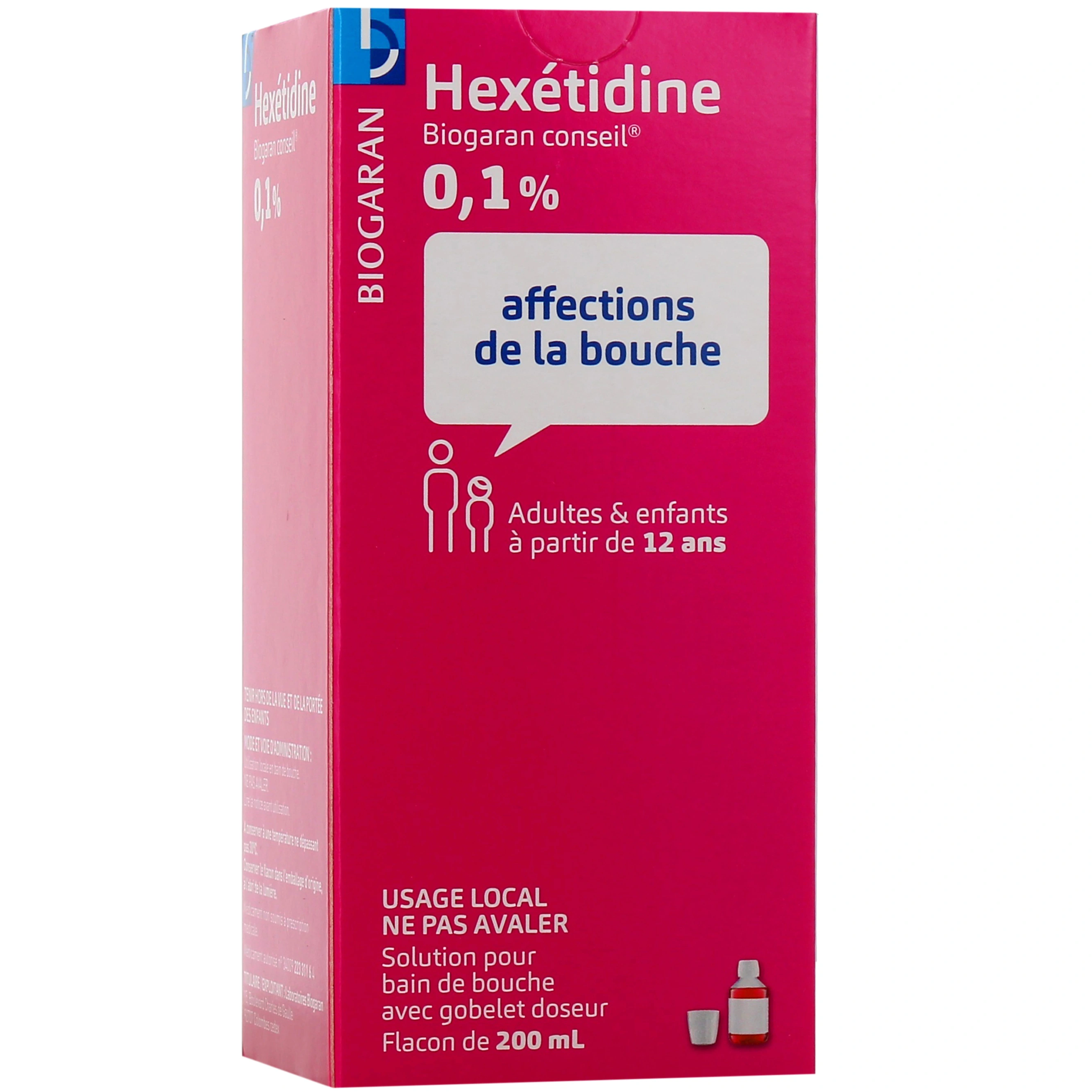 Hexetidine 0,1% est un médicament sous forme de solution pour bain de bouche, et indiqué en cas d'affections de la bouche et à la suite d'opération des gencives ou des dents chez l'adulte et l'enfant de plus de 12 ans.