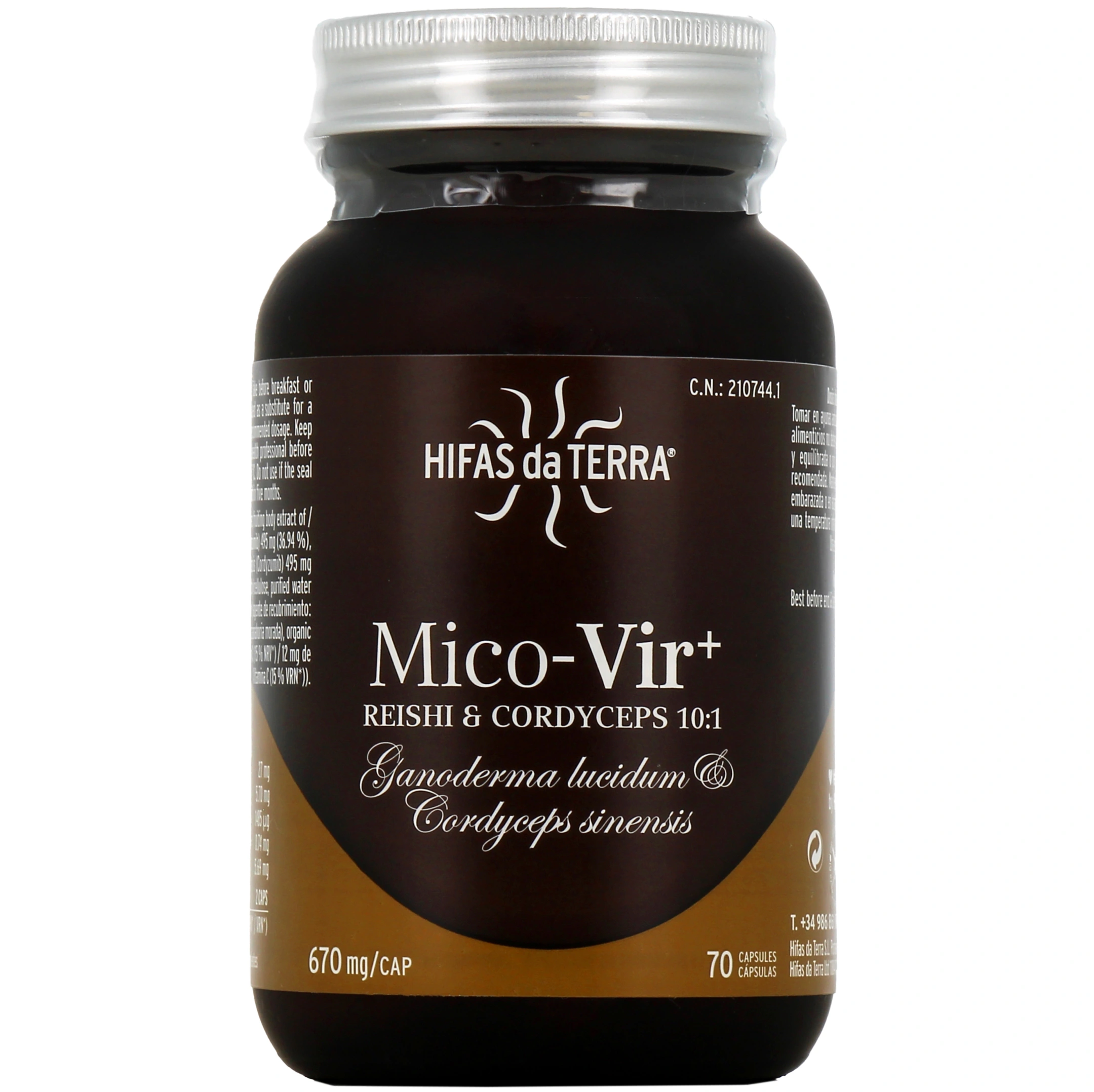 Mico-Vir+ Hifas da Terra est une synergie d'extraits biologiques de champignons Reishi (Ganoderma lucidum) et Cordyceps (Cordyceps sinensis). Ce complexe utilise uniquement les sporophores (parties aériennes) de Reishi cultivés sur un substrat 100 % biologique et du mycélium de Cordyceps cultivé en bioréacteur.