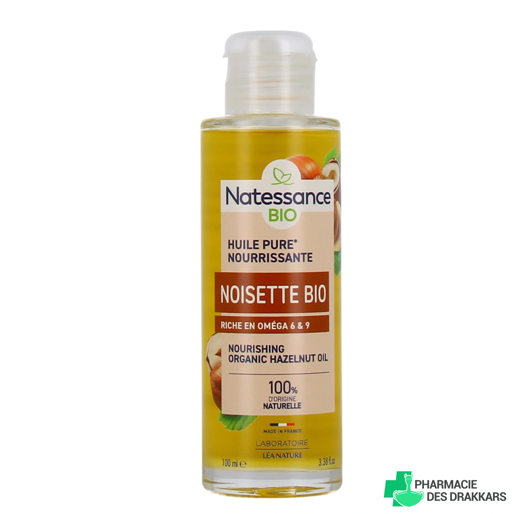 Vous pourrez retrouver l'huile de noisette Bio Natessance par le laboratoire Léa Nature dans les présentations suivantes chez Pharmacie des Drakkars : flacon de 100 ml d'huile 100% végétale.
