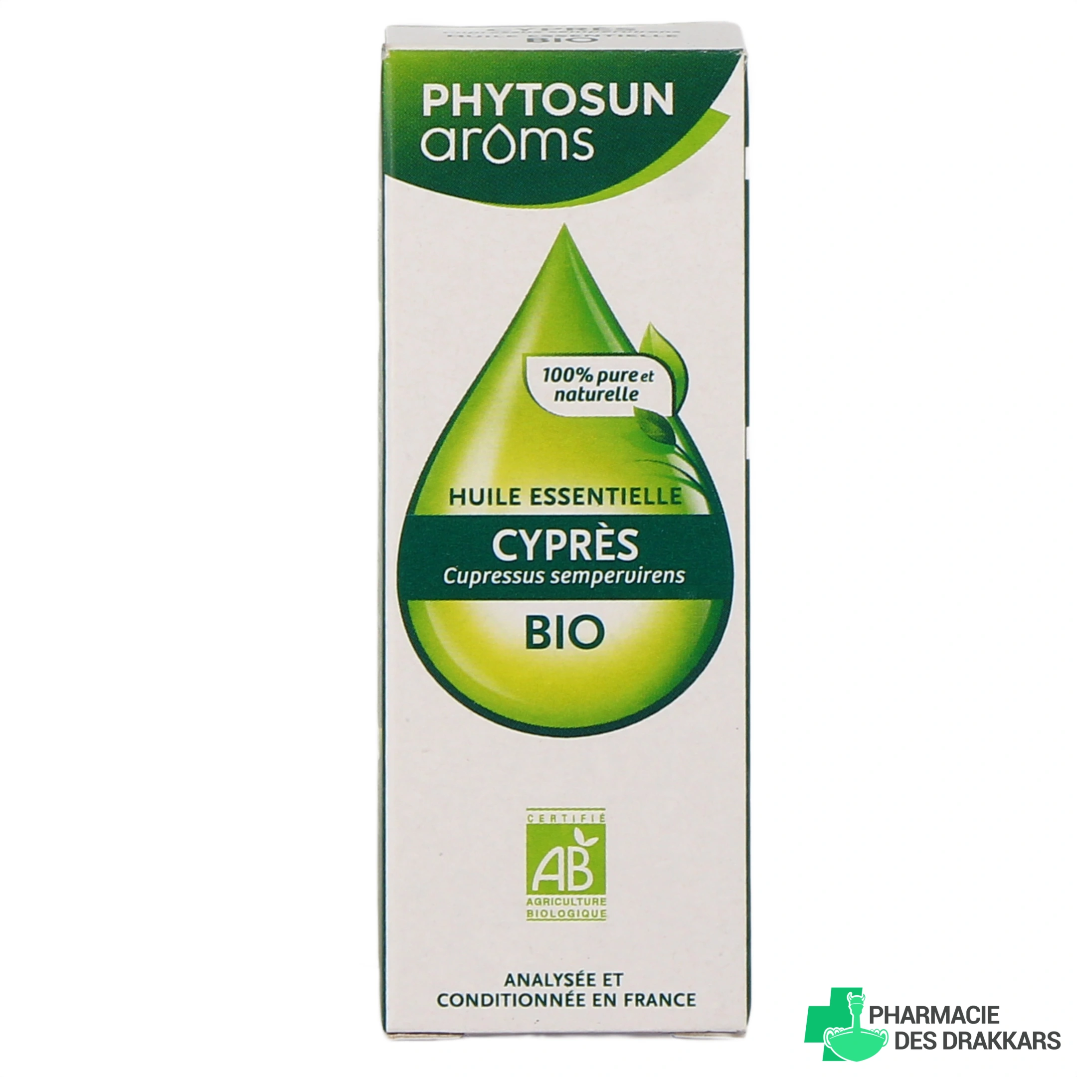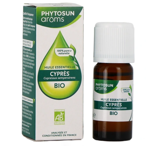 Le Cyprès se voit également prêter des bienfaits traditionnels, raison pour laquelle Phytosun Aroms a utilisé les rameaux de ce végétal pour en faire une huile essentielle botaniquement et biochimiquement définie. Les arbres utilisés ont été cultivés et récoltés en totale conformité avec les principes posés par le Label AB (Agriculture Biologique), et le procédé d'extraction mis à profit (par entraînement à la vapeur d'eau) permet la préservation des principes actifs. L'huile essentielle de Cyprès ainsi obtenue est entièrement pure et naturelle.