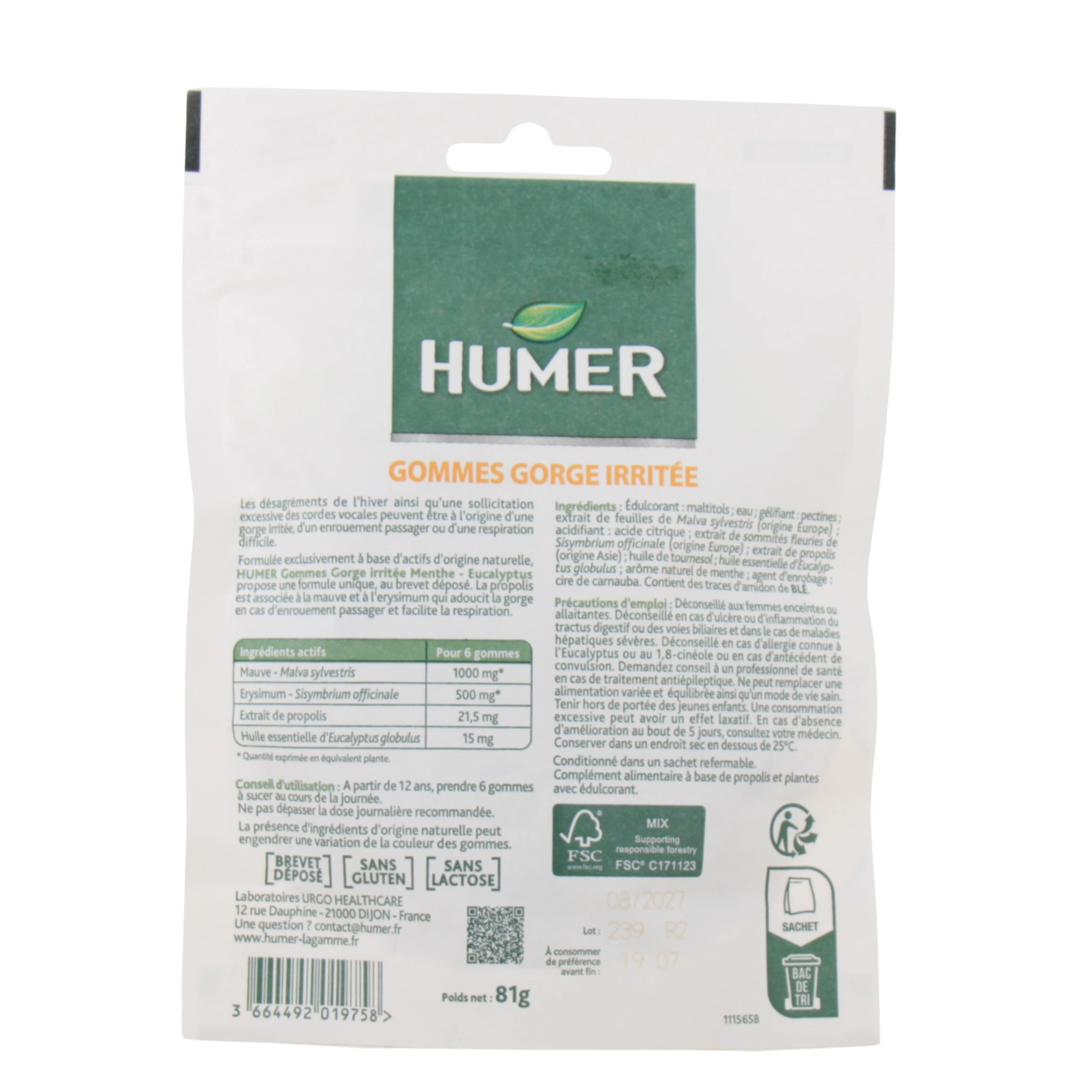 Les désagréments de l'hiver ainsi qu'une utilisation excessive des cordes vocales peuvent être à l'origine d'une gorge sensible ou d'un enrouement passager. Formulées exclusivement à base d'ingrédients d'origine naturelle, Humer Gommes Gorge sensible est un complément alimentaire qui se présente sous la forme de gommes à sucer à 100 % d'origine naturelle, et propose une formule unique, au brevet déposé. Humer Gommes gorge sensible adoucit la gorge en cas de gêne grâce à la mauve, apaise en cas d'enrouement passager grâce à l'erysimum, et associe la propolis au miel.