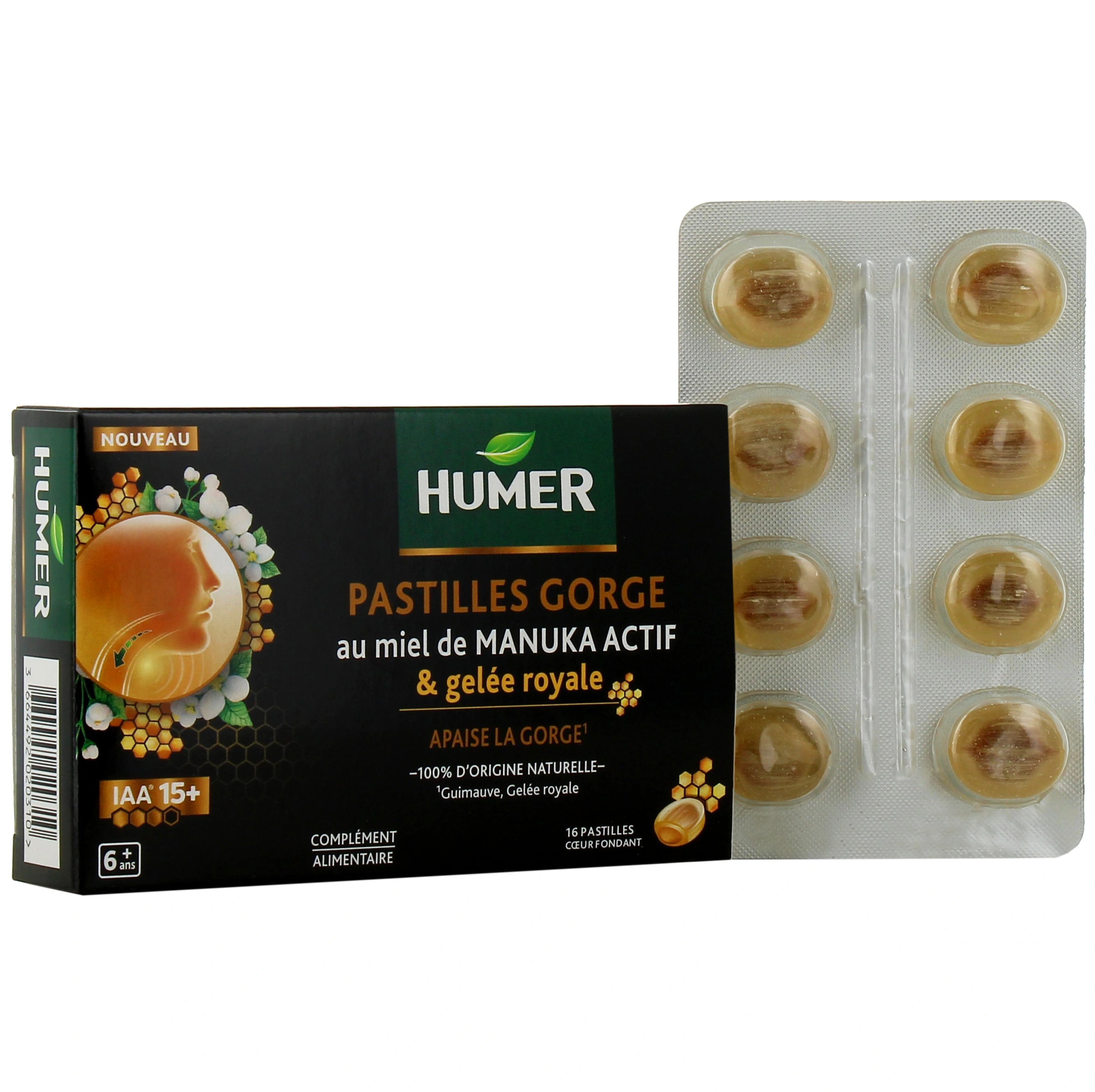 Gorge qui gratte, qui picote ou qui vous gêne ? Vous souffrez régulièrement d'angines, ou de petits maux de gorge occasionnels ? Alors les pastilles gorge au miel de Manuka actif Humer sont faites pour vous ! Formulées à partir de guimauve et d'huile essentielle d'Eucalyptus globulus, ces pastilles sont des compléments alimentaires conçus pour vous aider à apaiser votre gorge.