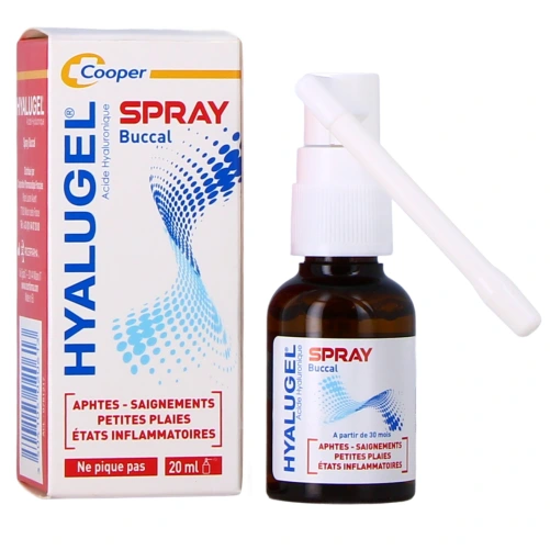 Le Spray buccal Hyalugel a été mis au point par Cooper avec une base constituée d'acide hyaluronique afin d'être utilisé en cas d'aphtes, de saignements, de petites plaies ou encore d'états inflammatoires.