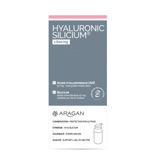 Complément alimentaire pour le bien-être de la peau, des articulations, des os, en prise sublinguale, qui associe de l’acide hyaluronique à haut poids moléculaire à du silicium.