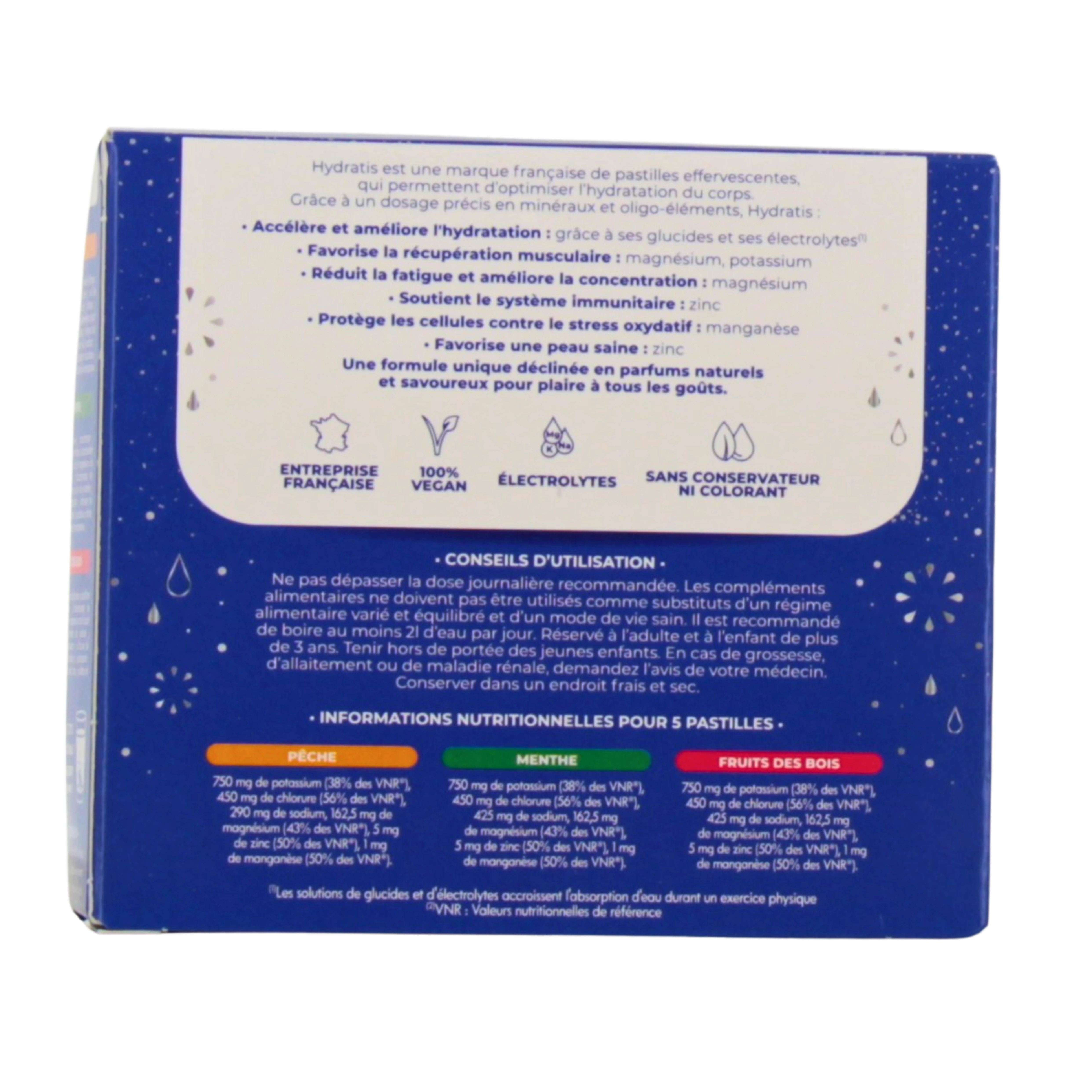 Hydratis est une solution d'hydratation accélérée sous forme de pastilles effervescentes, pour éviter la déshydratation pendant le sport, une canicule, un voyage ou la consommation d'alcool. Goût au choix.