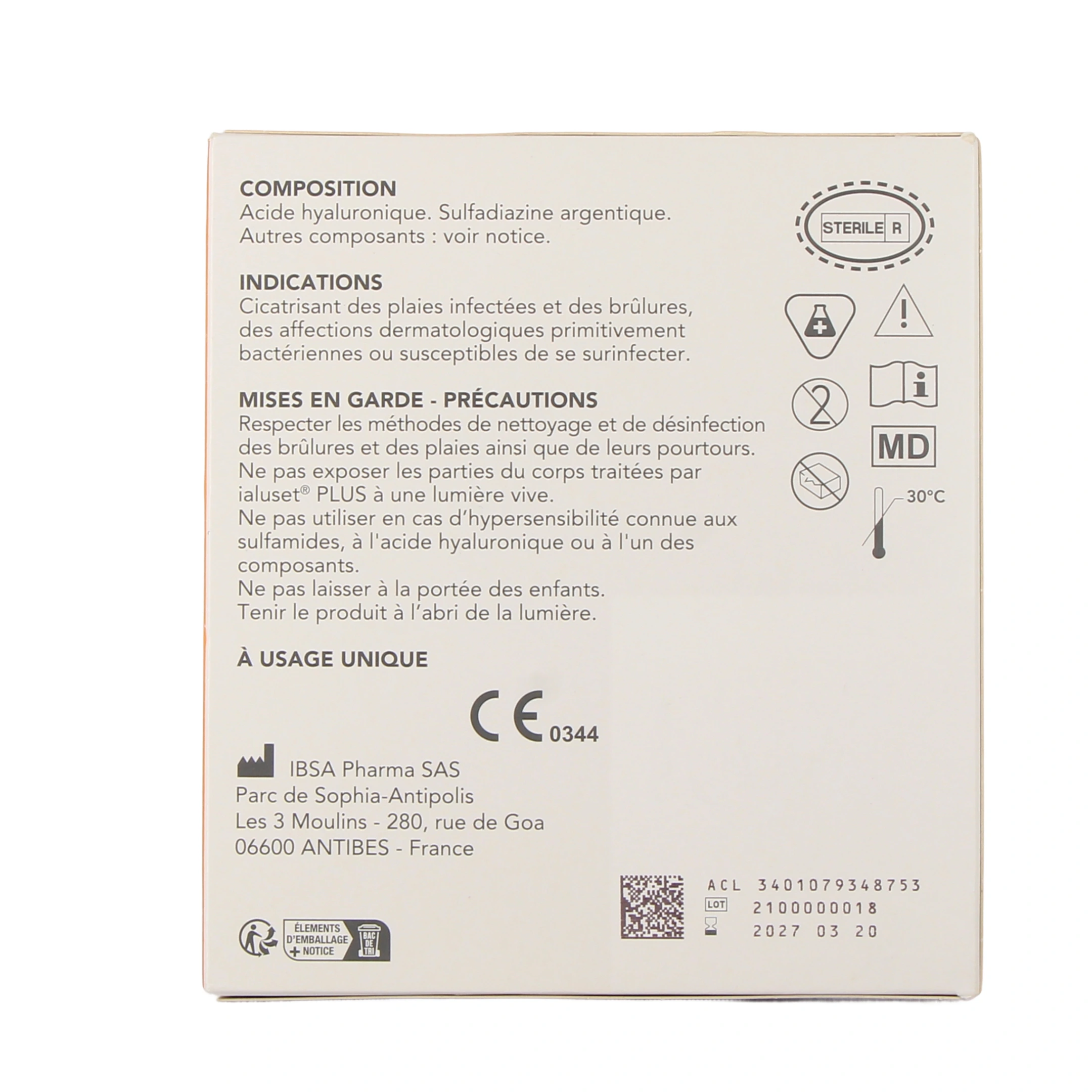Mise en garde et précautions d'emploi : Usage unique. Respecter les méthodes de nettoyage et de désinfection des brûlures et des plaies ainsi que de leurs pourtours. Ne pas exposer les parties du corps traitées par Ialuset Plus à une lumière vive. Ne pas utiliser si l'emballage unitaire est endommagé. Ne pas utiliser en cas d'allergie à l'un des constituants. Ne pas laisser à la portée des enfants. Tenir le produit à l'abri de la lumière. Conserver à une température inférieure à 30 °C.