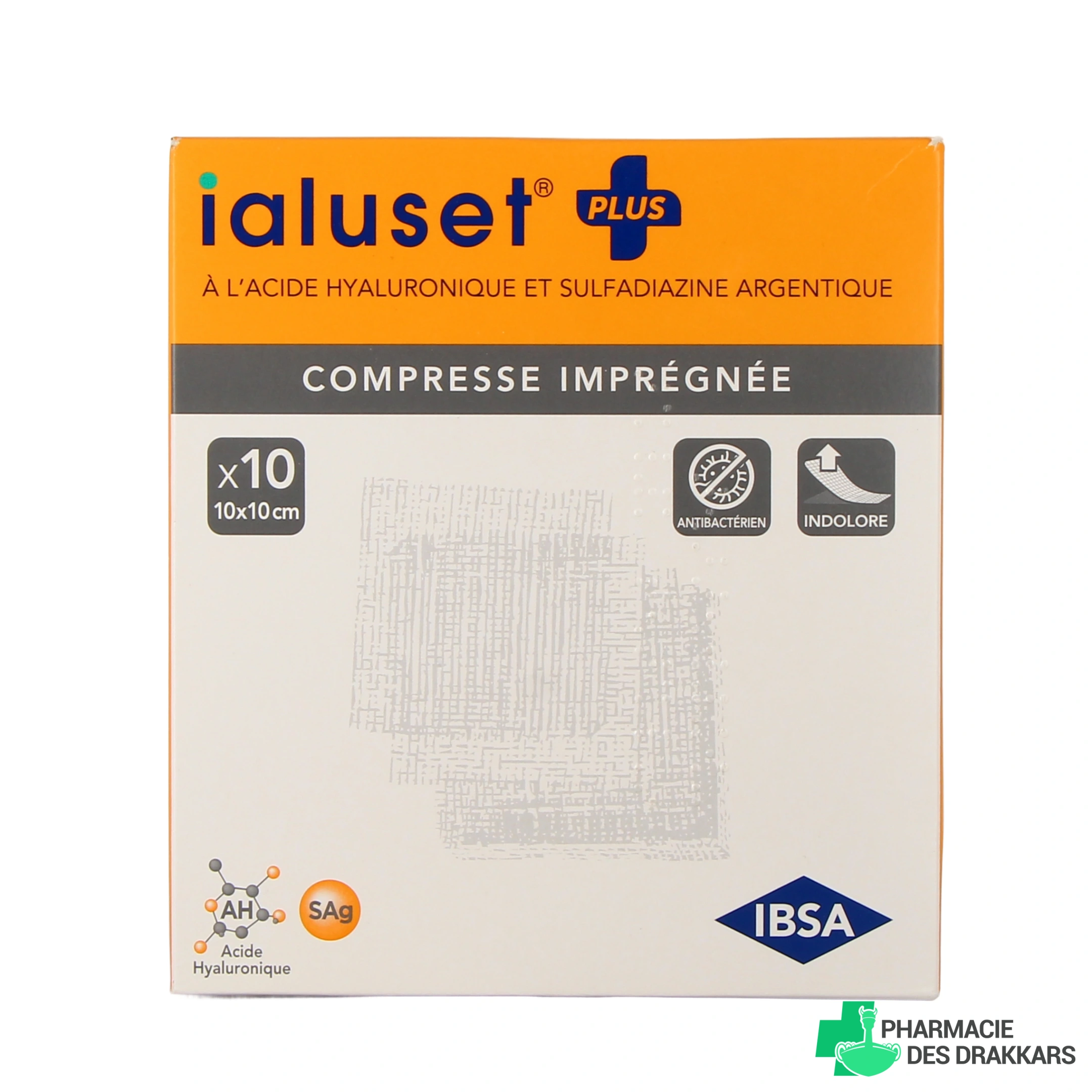 Présentation disponible pour les compresses Ialuset Plus sur notre pharmacie en ligne : Boîte de 10 compresses imprégnées stériles